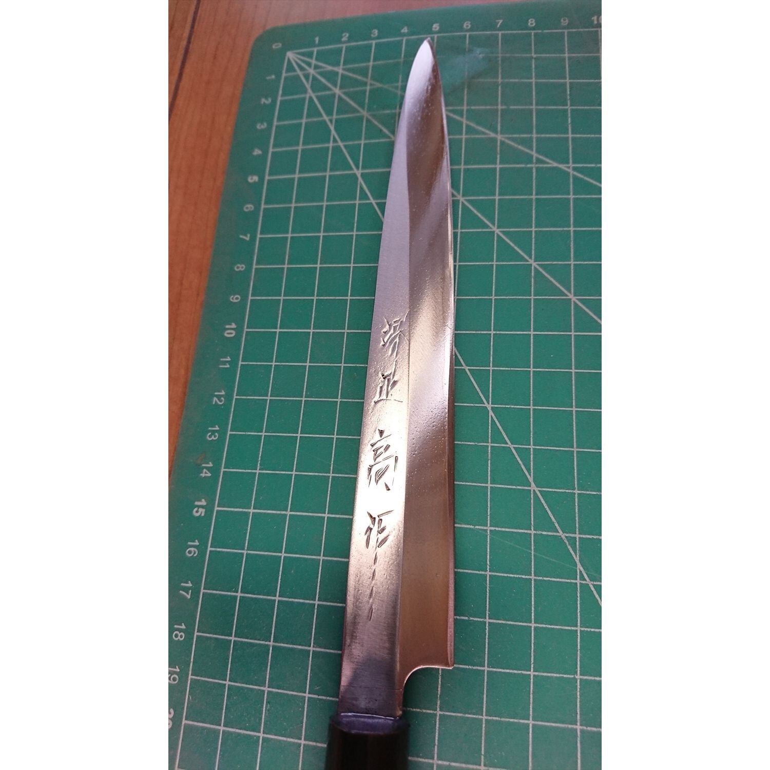 1. o3313/状態:中古/銘:堺正高/刺身包丁(片刃 右利き用)/刃長:180/峰厚 アゴ上:3.8/重量:103/作り:安来鋼 水牛柄/他:ツバの根元から柄全体にかけて樹脂コーティング済み(防サビ防汚の為)