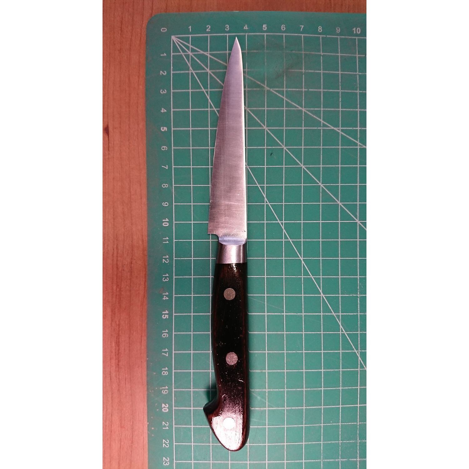 1. o3322/状態:中古/銘:東京杉本/ペティナイフ(両刃 約 左1:右9 右利き用)/刃長:105/峰厚 アゴ上:1.2/重量:66/作り:鋼/他:ツバの根元から柄全体にかけて樹脂コーティング済み(防サビ防汚の為)