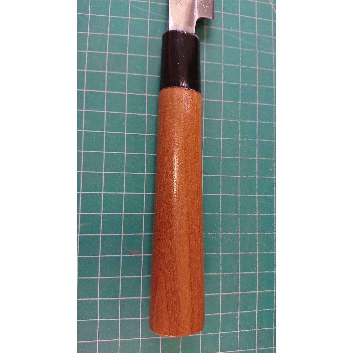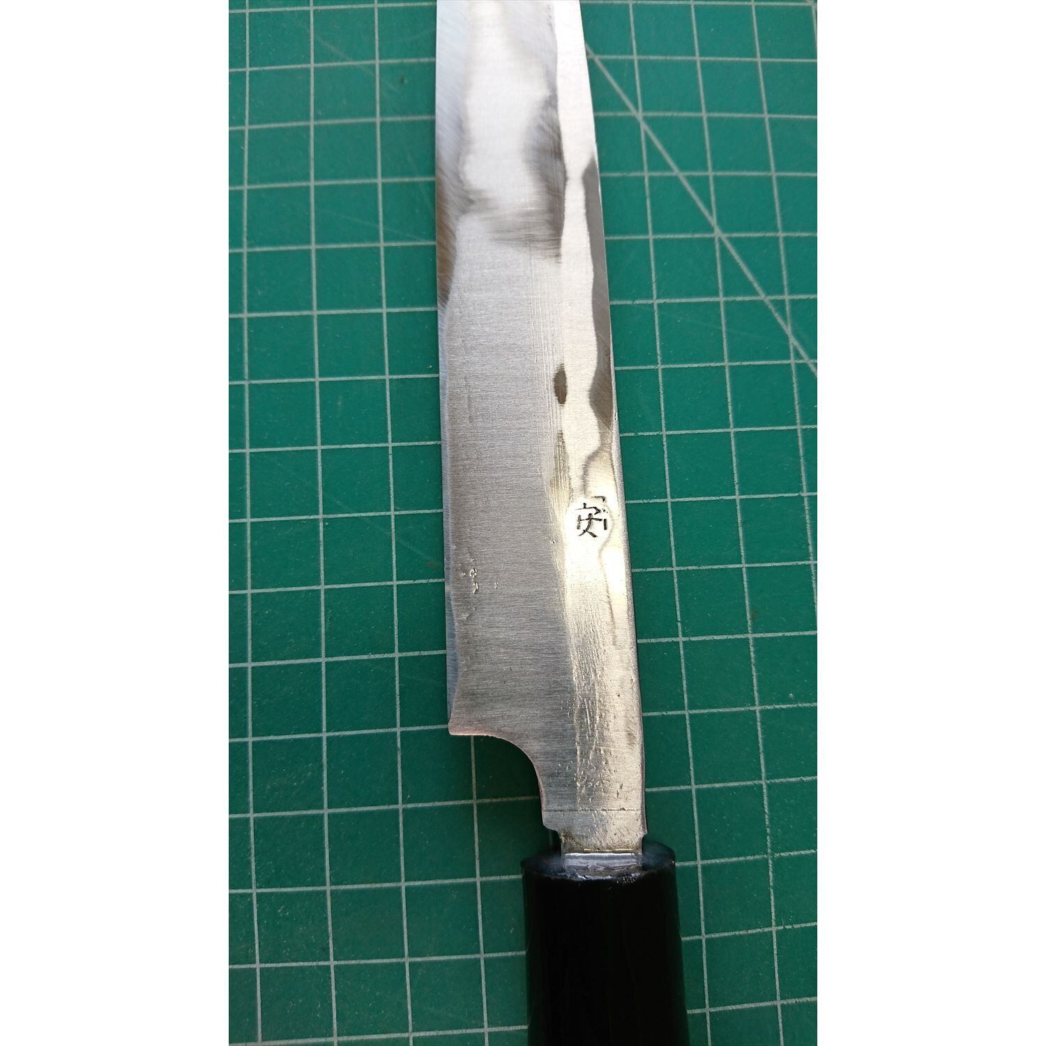 1. o3326/状態:中古/銘:兼安/刺身包丁(片刃 右利き用)/刃長:210/峰厚 アゴ上:3.2/重量:114/作り:鋼/他:ツバの根元から柄全体にかけて樹脂コーティング済み(防サビ防汚の為)