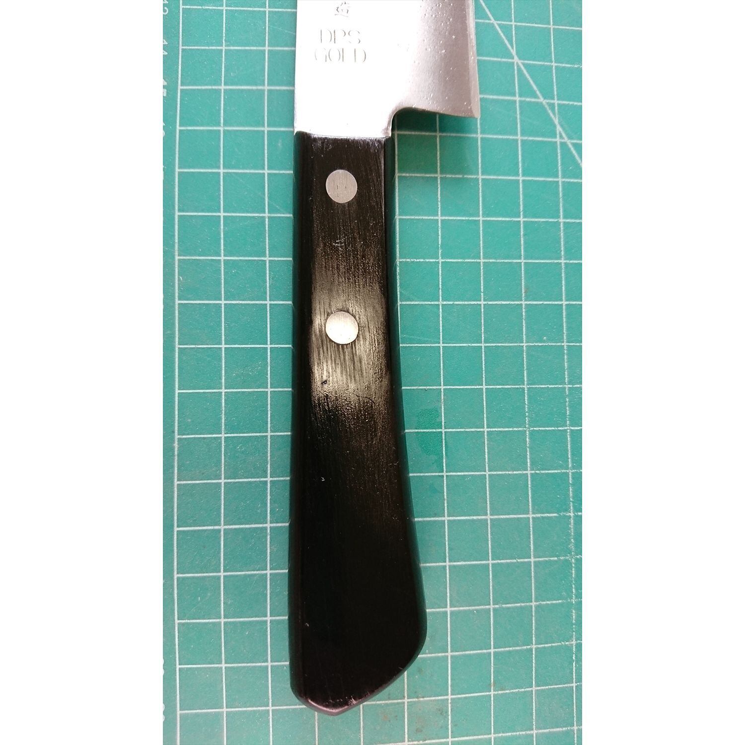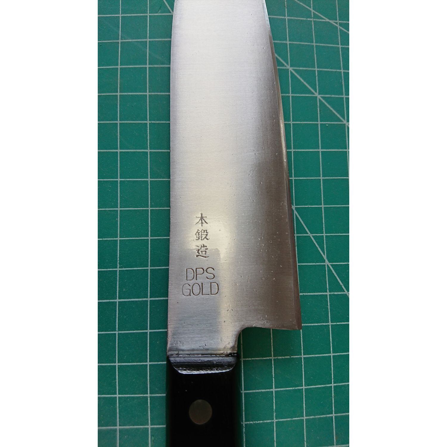 1. o3391/状態:中古/銘:源明利/三徳包丁(両刃 左5:右5 右利き・左利き兼用)/刃長:160/峰厚 アゴ上:2.8/重量:136/作り:本鍛造 DPS GOLD 割込鋼(鋼をステンレスでサンド)/他: