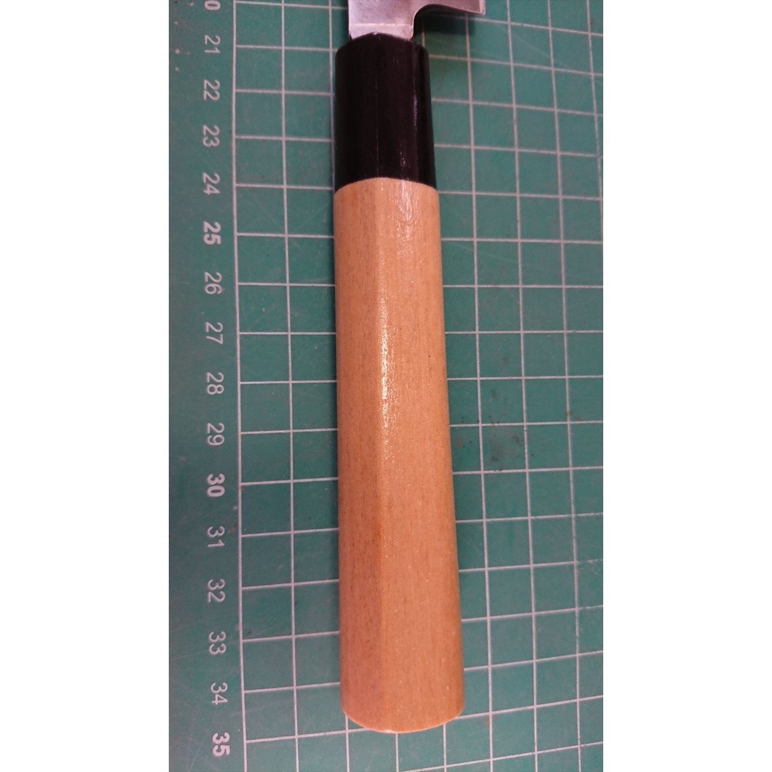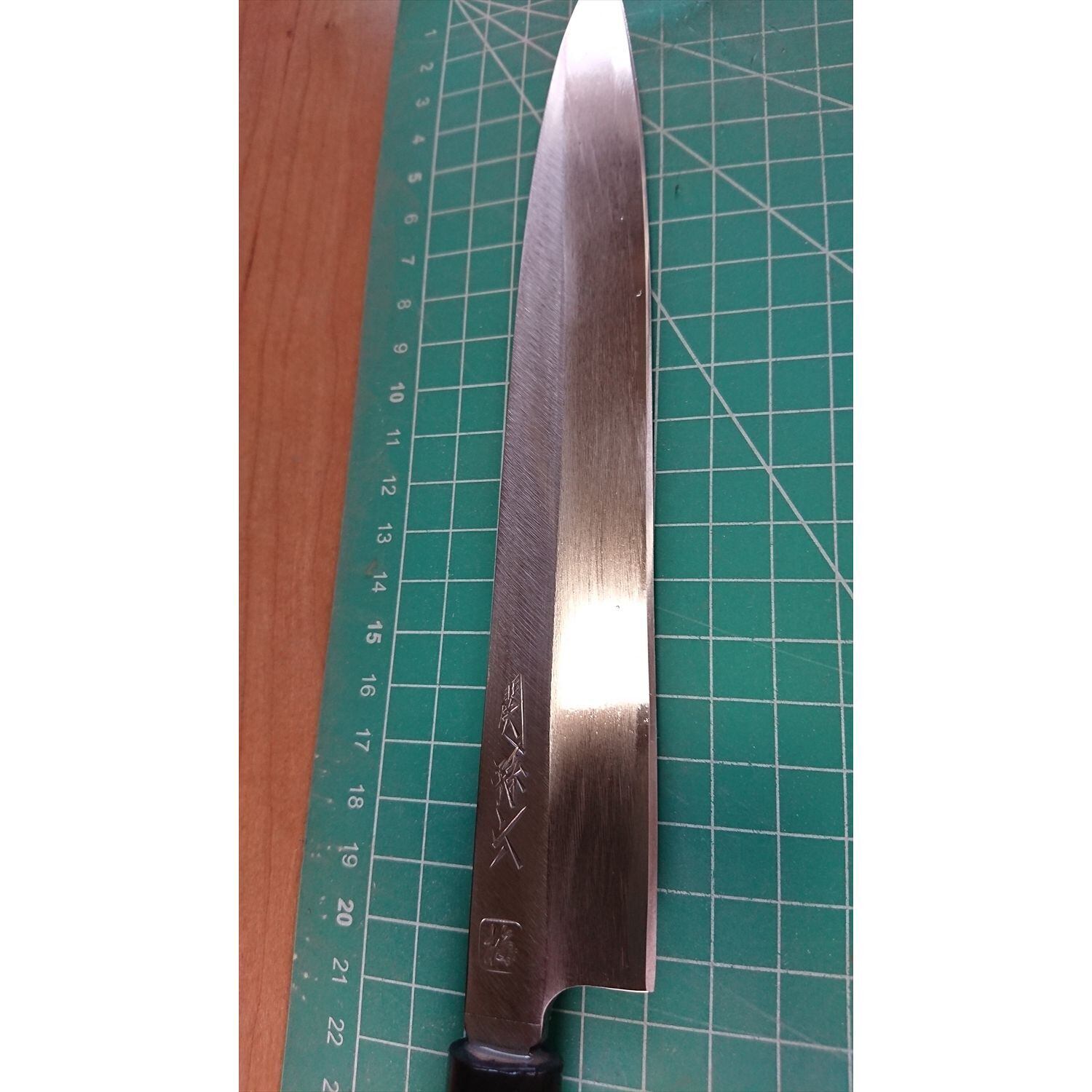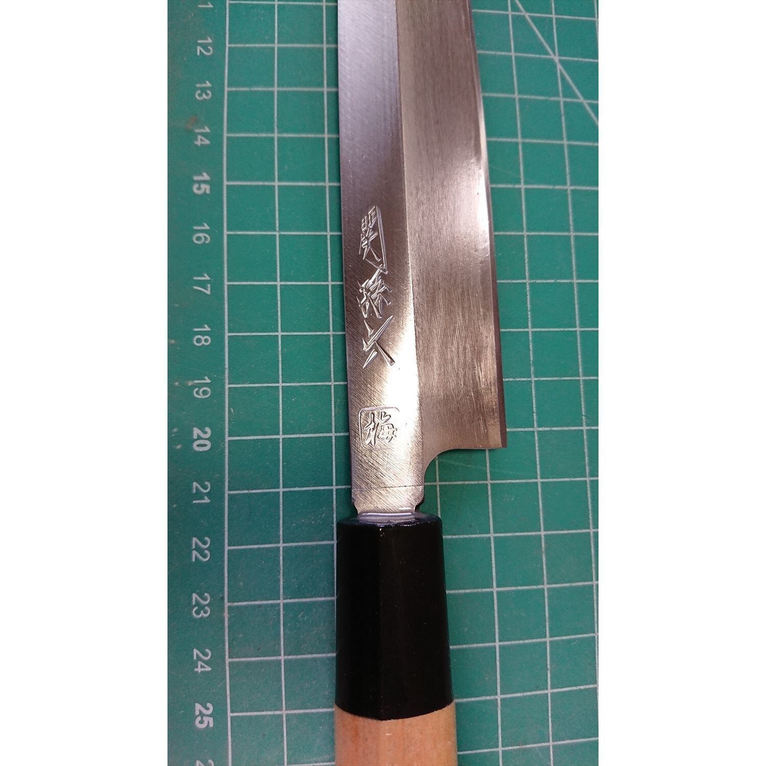 1. o3357/状態:中古/銘:関孫六 梅/刺身包丁(片刃 右利き用)/刃長:205/峰厚 アゴ上:3.5/重量:118/作り:鋼/他:ツバの根元から柄全体にかけて樹脂コーティング済み(防サビ防汚の為)