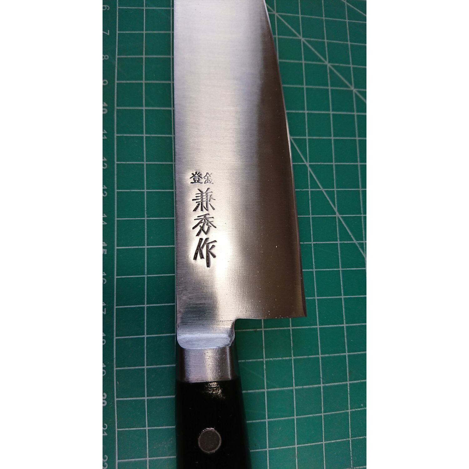 1. o3389/状態:中古/銘:兼秀/牛刀(両刃 左5:右5 右利き・左利き兼用)/刃長:175/峰厚 アゴ上:1.8/重量:156/作り:鋼/他:柄はオーバーホール済み。ツバの根元から柄全体にかけて樹脂コーティング済み(防サビ防汚の為)