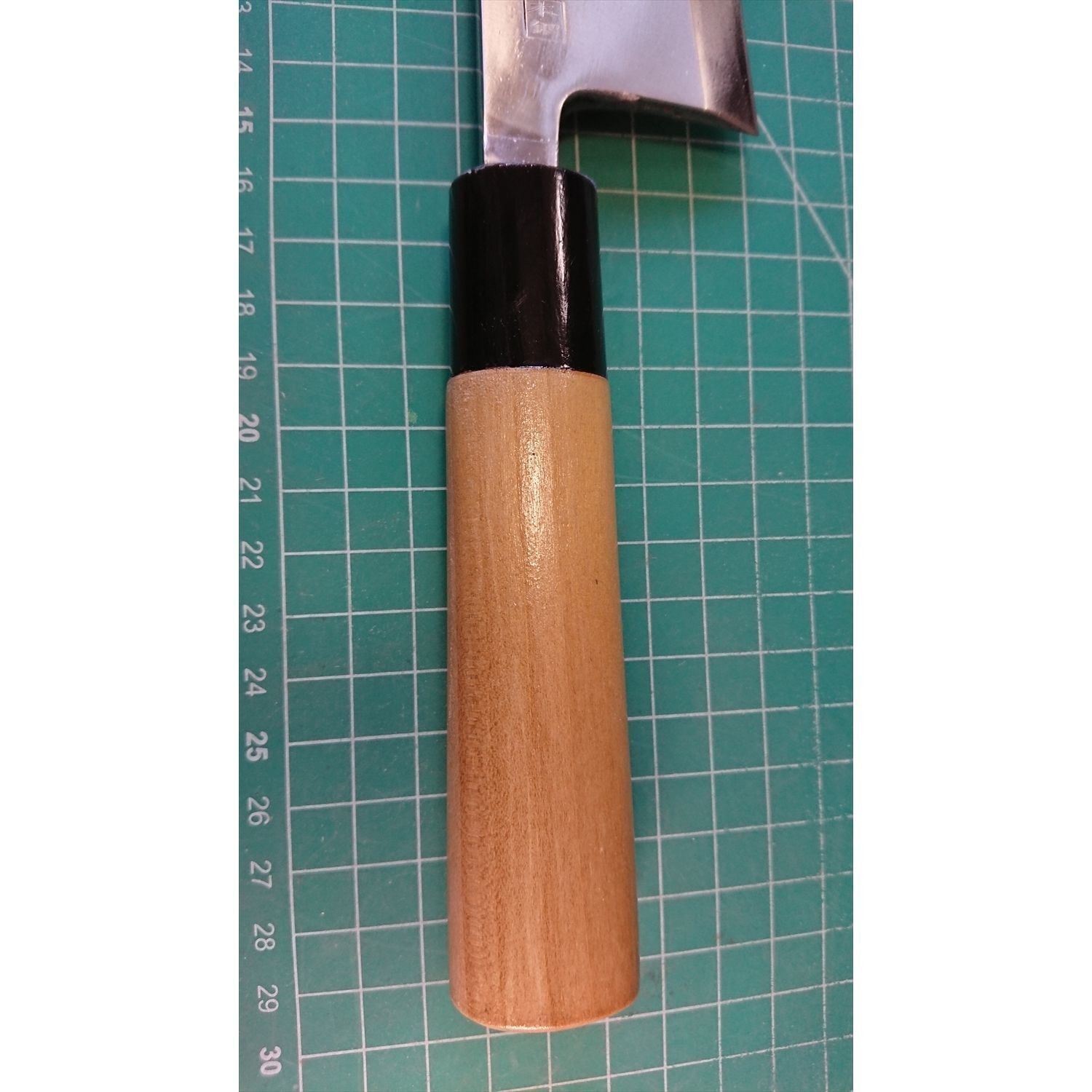 1. o3345/状態:中古/銘:関孫六 銀寿/出刃包丁(片刃 右利き用)/刃長:150/峰厚 アゴ上:6.9/重量:236/作り:本綱/他:ツバの根元から柄全体にかけて樹脂コーティング済み(防サビ防汚の為)