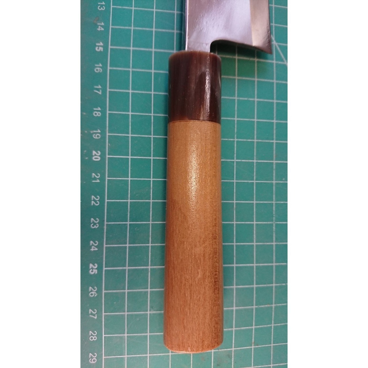 1. o3346/状態:中古/銘:三友上作/出刃包丁(片刃 右利き用)/刃長:150/峰厚 アゴ上:6.5/重量:181/作り:鋼 水牛柄/他:ツバの根元から柄全体にかけて樹脂コーティング済み(防サビ防汚の為)