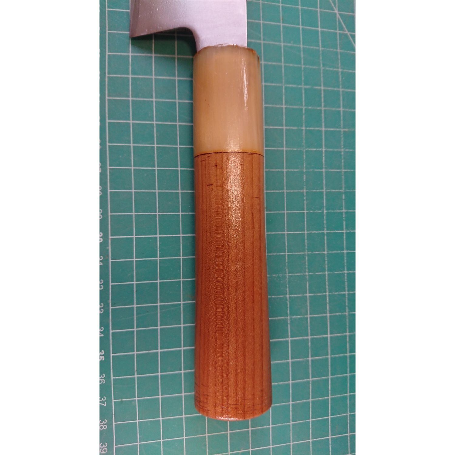 1. o3332/状態:中古/銘:堺正元/相出刃包丁(両刃 左5:右5 右利き・左利き兼用)/刃長:210/峰厚 アゴ上:3.6/重量:287/作り:鋼 最高級 水牛柄/他:ツバの根元から柄全体にかけて樹脂コーティング済み(防サビ防汚の為)