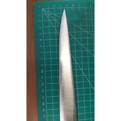 1. o3336/状態:中古/銘:銘?/刺身包丁(両刃 約 左1:右9 右利き用)/刃長:240/峰厚 アゴ上:3.9/重量:143/作り:鋼/他:ツバの根元から柄全体にかけて樹脂コーティング済み(防サビ防汚の為)