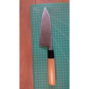 1. o3374/状態:中古/銘:関孫六 銀寿/出刃包丁(片刃 右利き用)/刃長:150/峰厚 アゴ上:8.1/重量:251/作り:鋼/他:ツバの根元から柄全体にかけて樹脂コーティング済み(防サビ防汚の為)
