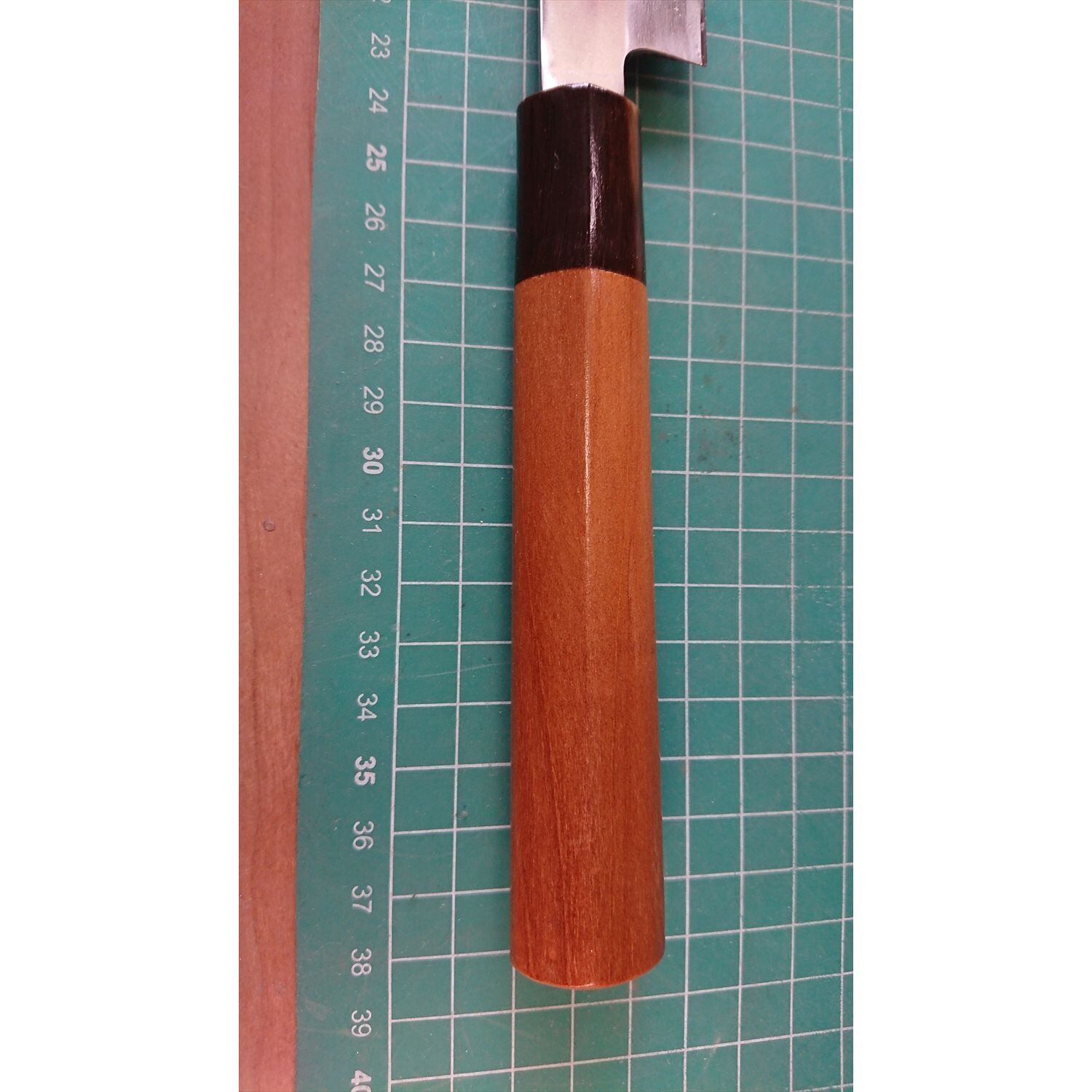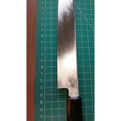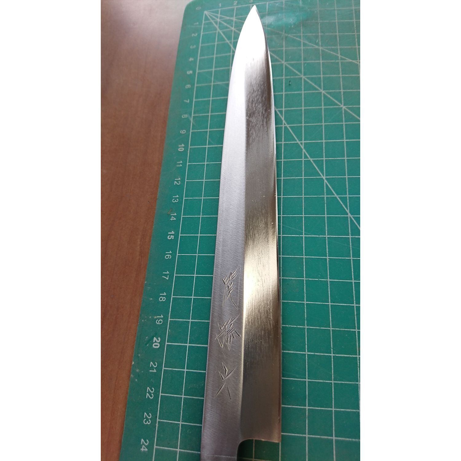 1. o3386/状態:中古/銘:関孫六/刺身包丁(片刃 右利き用)/刃長:230/峰厚 アゴ上:3.7/重量:124/作り:鋼 本水牛柄/他:ツバの根元から柄全体にかけて樹脂コーティング済み(防サビ防汚の為)