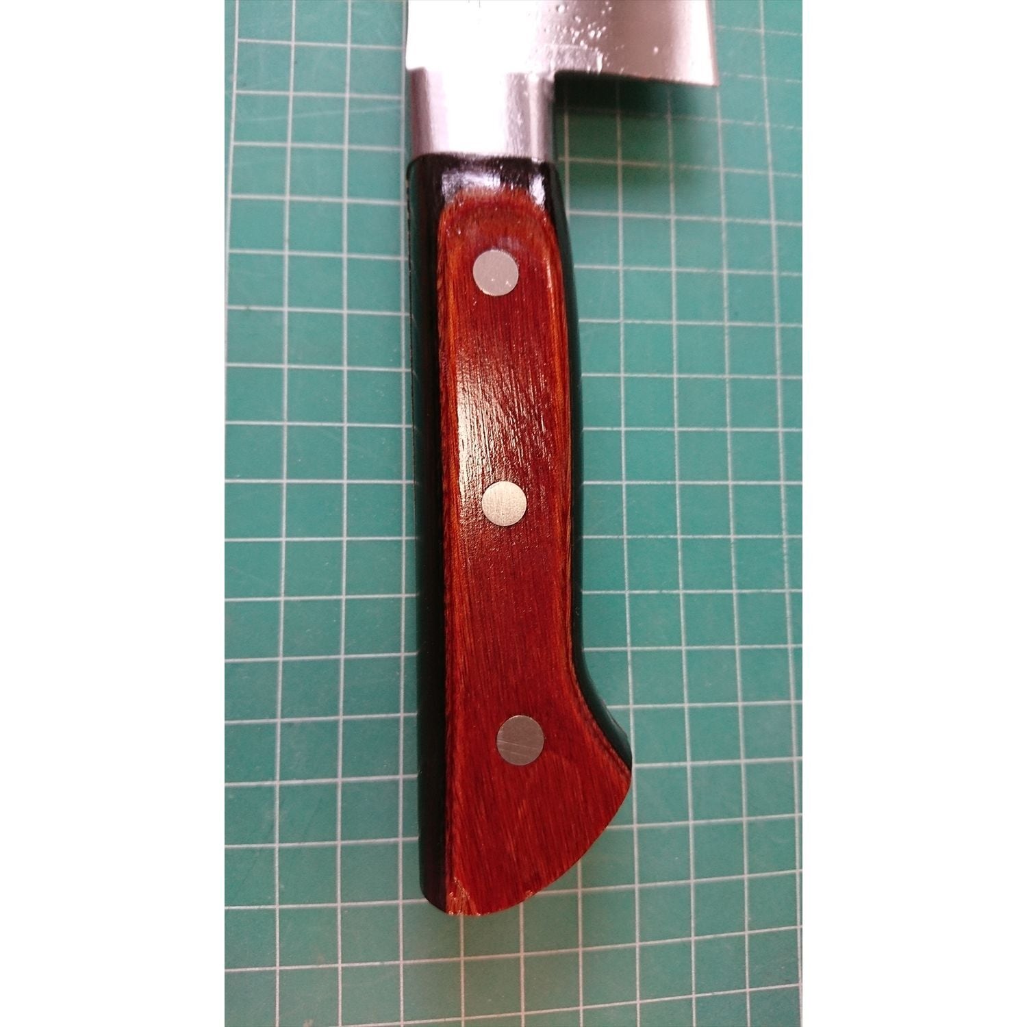1. o3393/状態:中古/銘:堺一文字光秀/牛刀(両刃 左5:右5 右利き・左利き兼用)/刃長:330/峰厚 アゴ上:2.8/重量:346/作り:安来鋼本打焼/他:ツバの根元から柄全体にかけて樹脂コーティング済み(防サビ防汚の為)