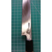 1. o3379/状態:中古/銘:三友上作/刺身包丁(片刃 右利き用)/刃長:225/峰厚 アゴ上:3.6/重量:136/作り:青紙鋼 水牛柄/他:ツバの根元から柄全体にかけて樹脂コーティング済み(防サビ防汚の為)