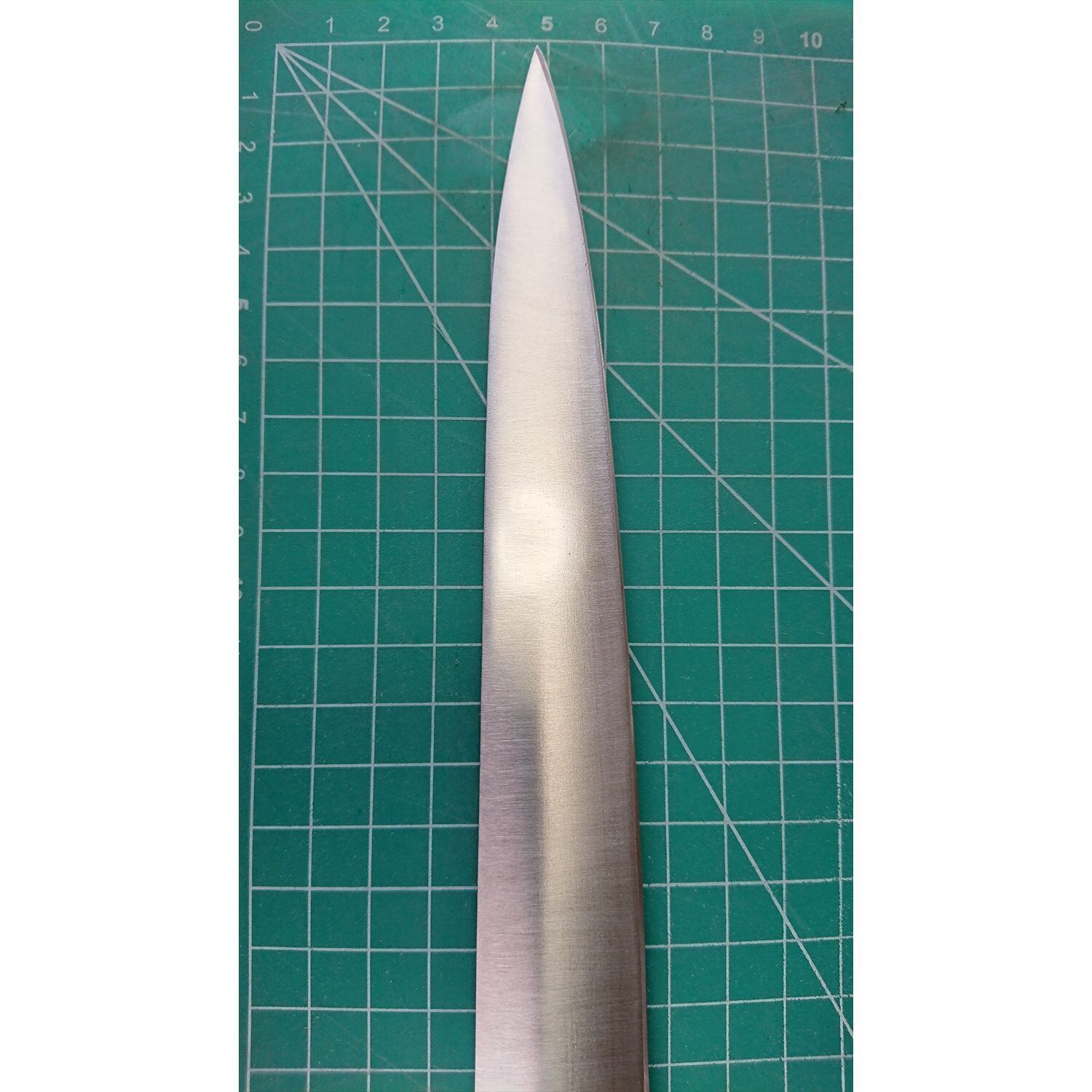 1. o3400/状態:中古/銘:ヘンケルス/筋引包丁(両刃 左5:右5 右利き・左利き兼用)/刃長:235/峰厚 アゴ上:2.5/重量:150/作り:ステンレス/他:銘はほぼ消失