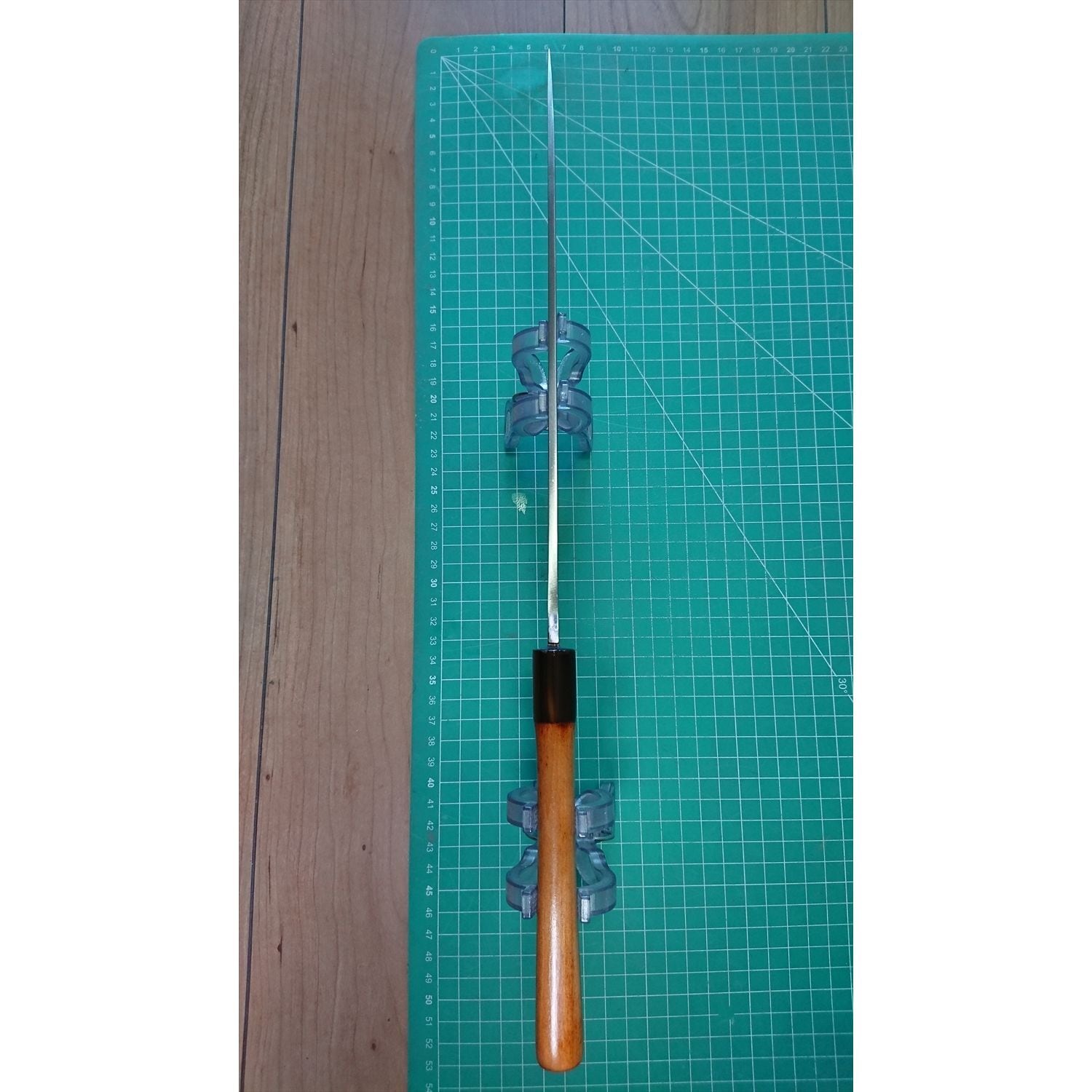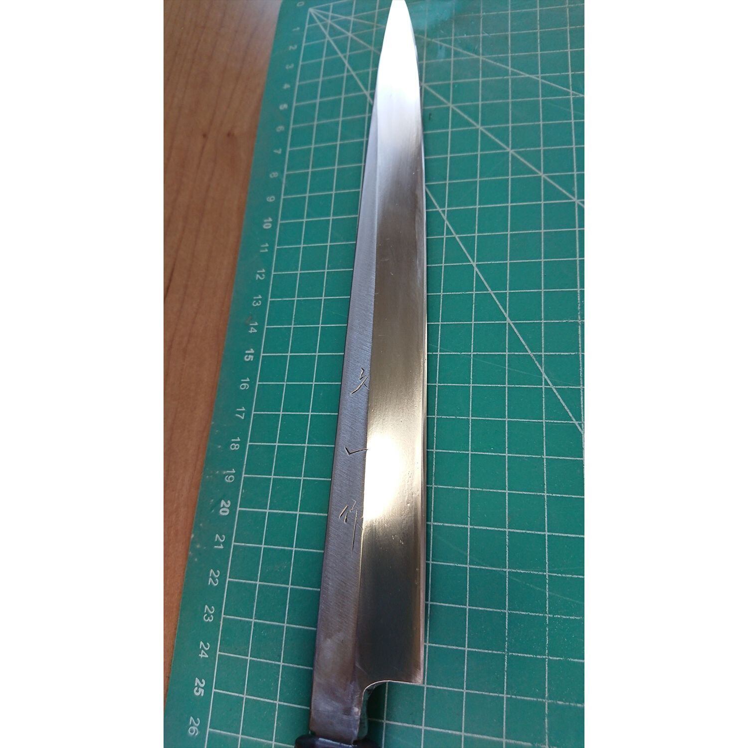 1. o3449/状態:中古/銘:久一/刺身包丁(片刃 右利き用)/刃長:240/峰厚 アゴ上:4.2/重量:141/作り:本鍛錬青鋼 水牛柄/他:ツバの根元から柄全体にかけて樹脂コーティング済み(防サビ防汚の為)