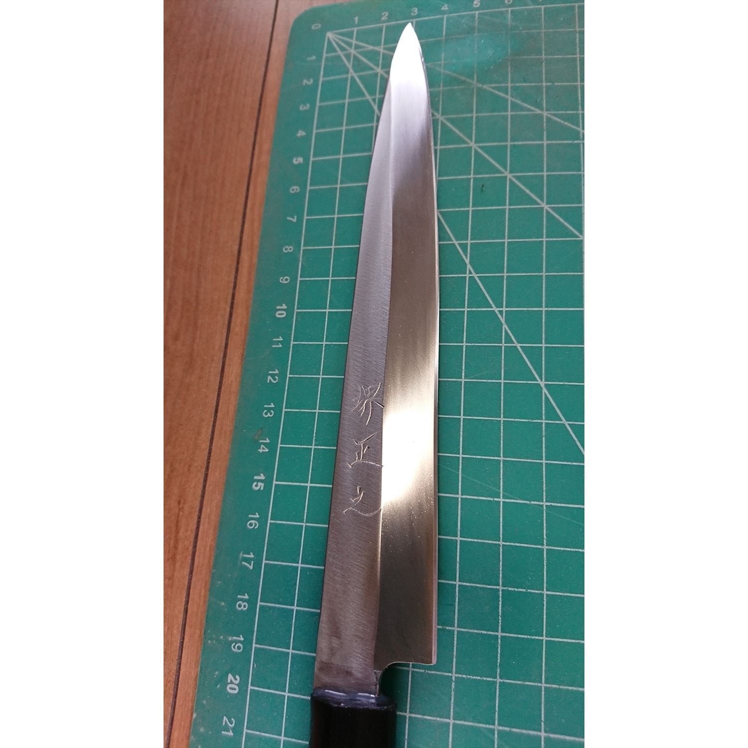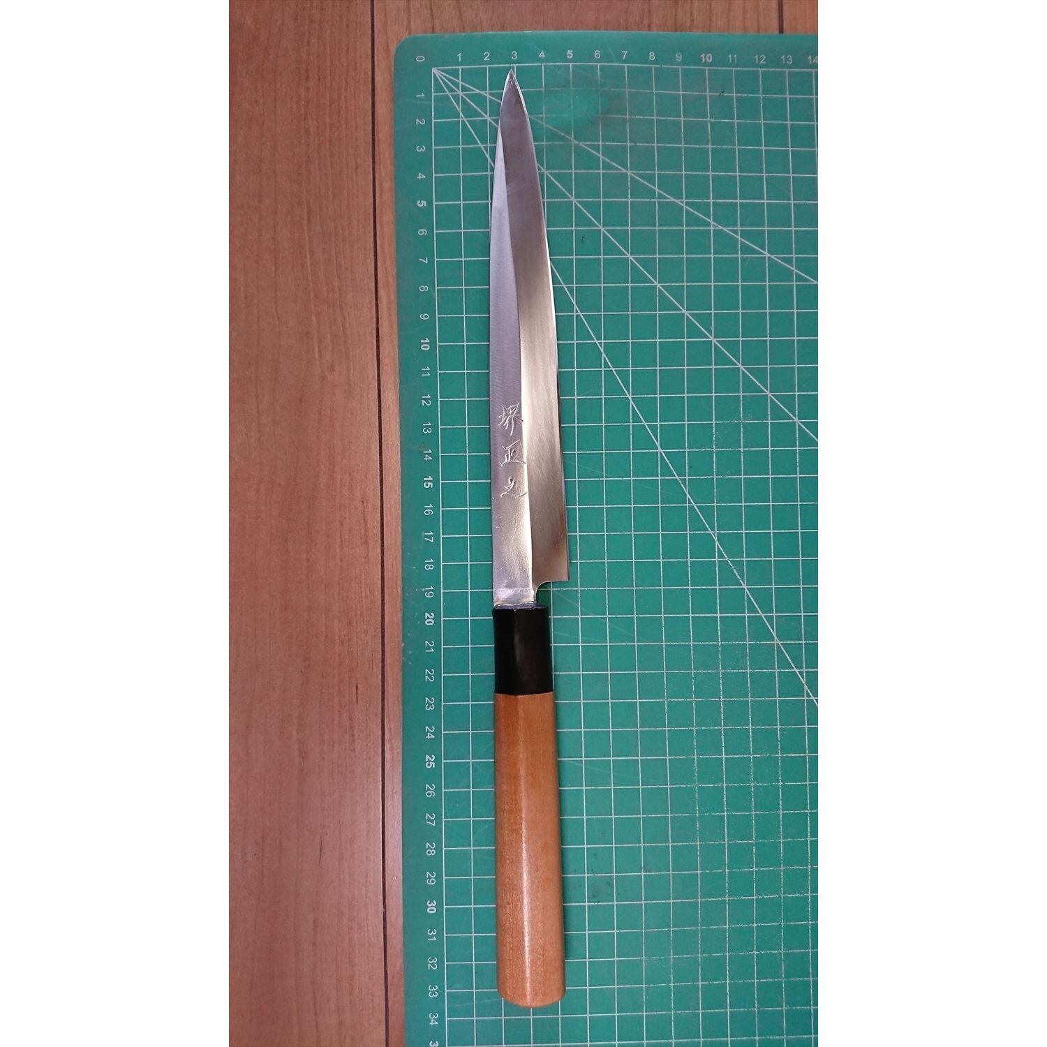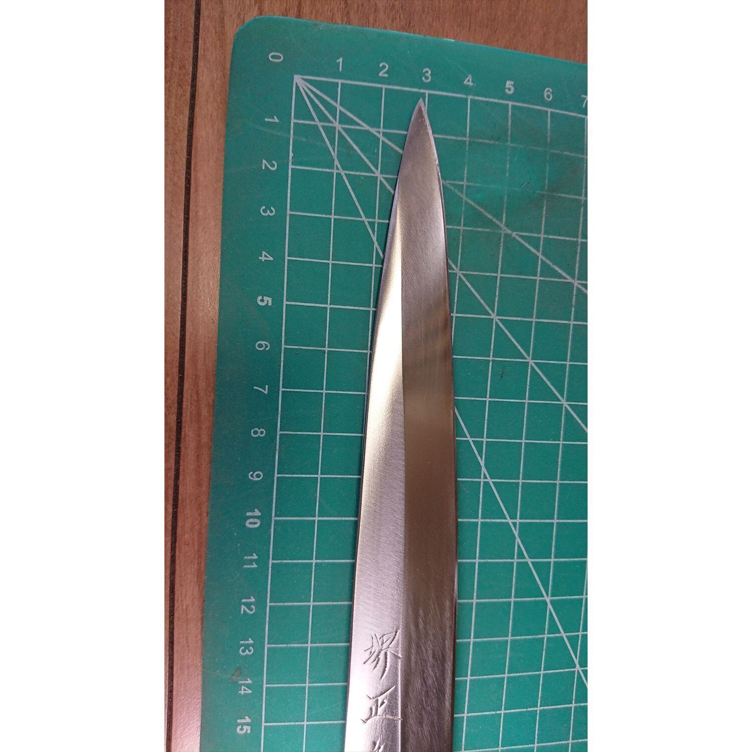 1. o3370/状態:中古/銘:堺正之/刺身包丁(片刃 右利き用)/刃長:190/峰厚 アゴ上:3.2/重量:108/作り:鋼/他:先端付近に一部引っ掛かりあり。ツバの根元から柄全体にかけて樹脂コーティング済み(防サビ防汚の為)