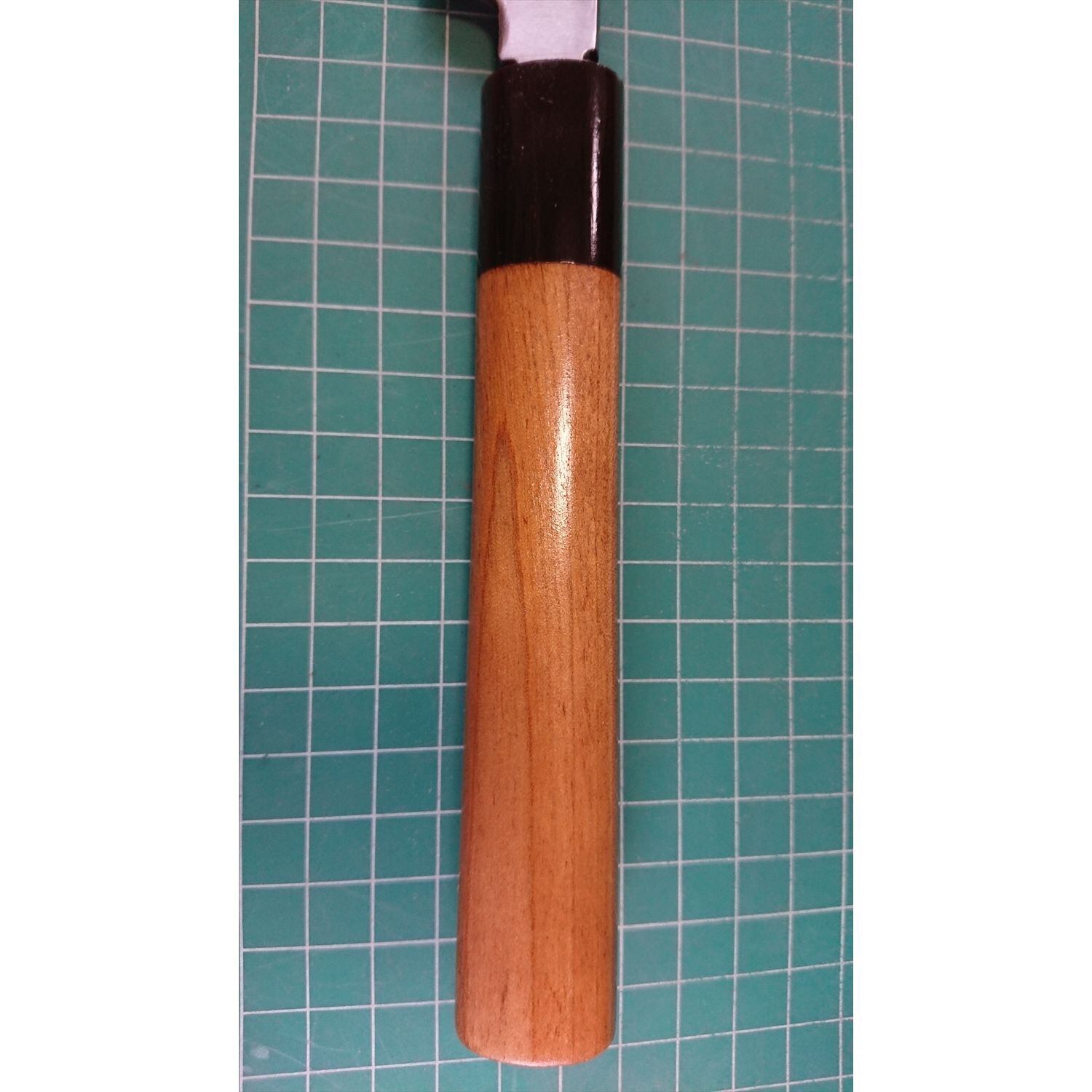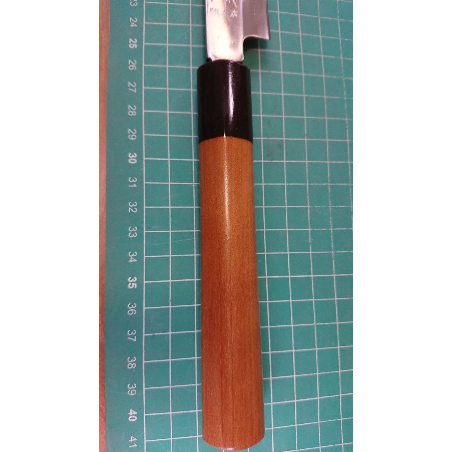 1. o3445/状態:中古/銘:正本総本店/刺身包丁(片刃 右利き用)/刃長:250/峰厚 アゴ上:3.9/重量:157/作り:鋼 水牛柄/他:ツバの根元から柄全体にかけて樹脂コーティング済み(防サビ防汚の為)