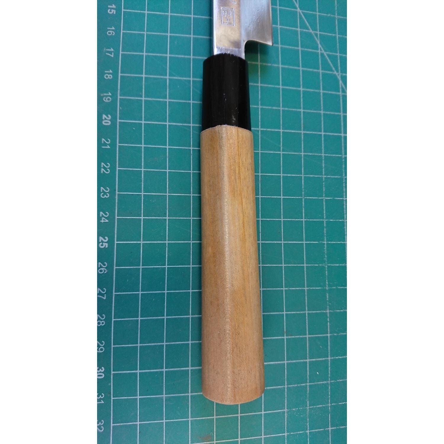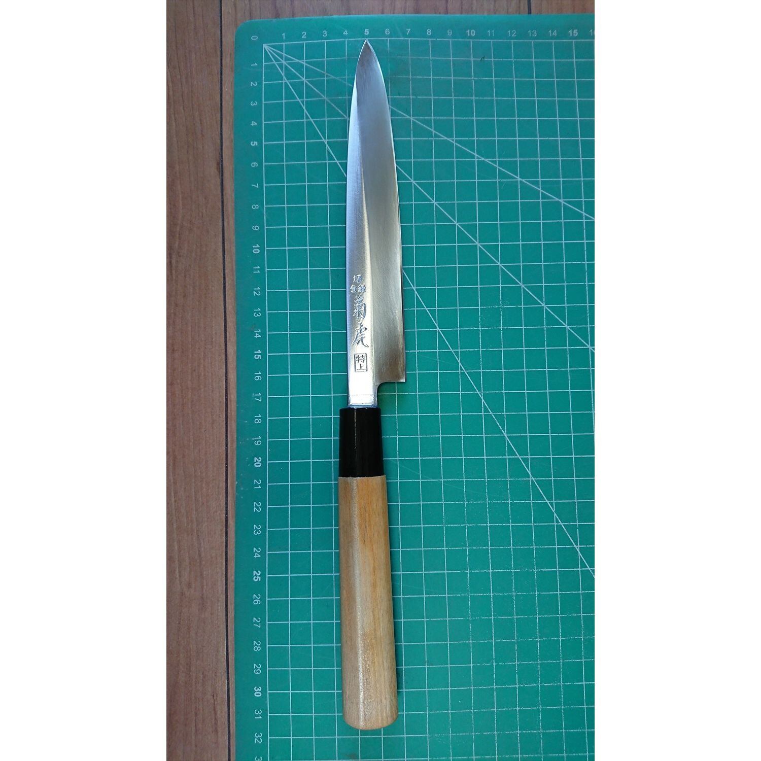 1. o3418/状態:中古/銘:堺菊虎/刺身包丁(片刃 右利き用)/刃長:165/峰厚 アゴ上:3.6/重量:104/作り:鋼/他:ツバの根元から柄全体にかけて樹脂コーティング済み(防サビ防汚の為)