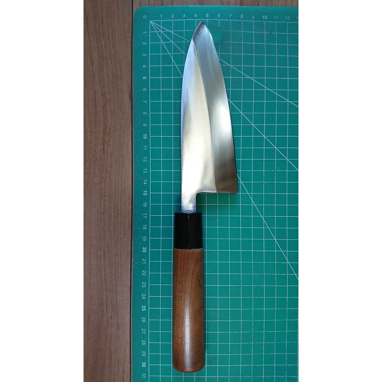 1. o3423/状態:中古/銘:銘?/出刃包丁(片刃 右利き用)/刃長:150/峰厚 アゴ上:5.0/重量:222/作り:鋼/他:ツバの根元から柄全体にかけて樹脂コーティング済み(防サビ防汚の為)