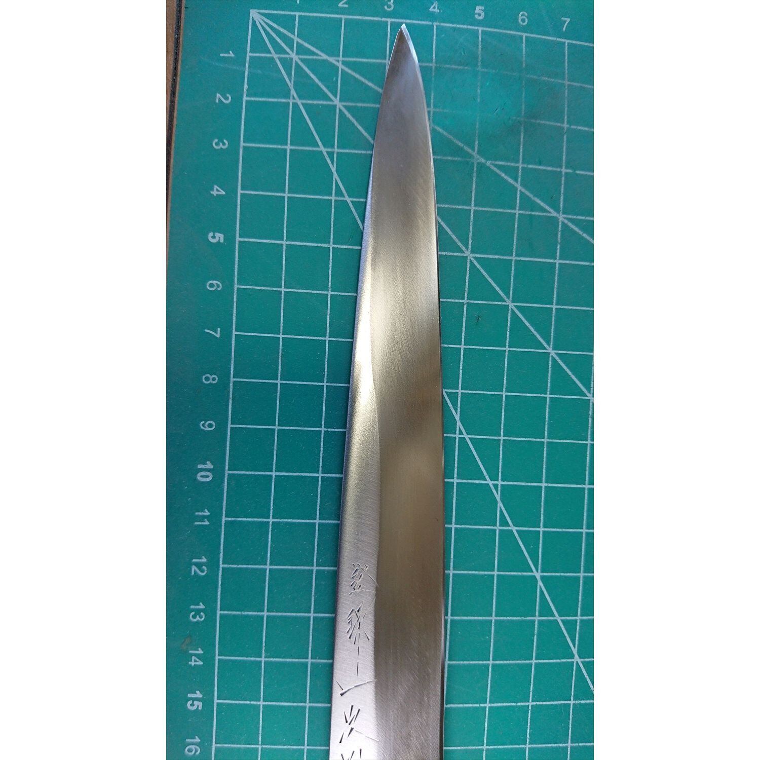 1. o3427/状態:中古/銘:堺一次/刺身包丁(片刃 右利き用)/刃長:190/峰厚 アゴ上:3.2/重量:84/作り:鋼/他:ツバの根元から柄全体にかけて樹脂コーティング済み(防サビ防汚の為)