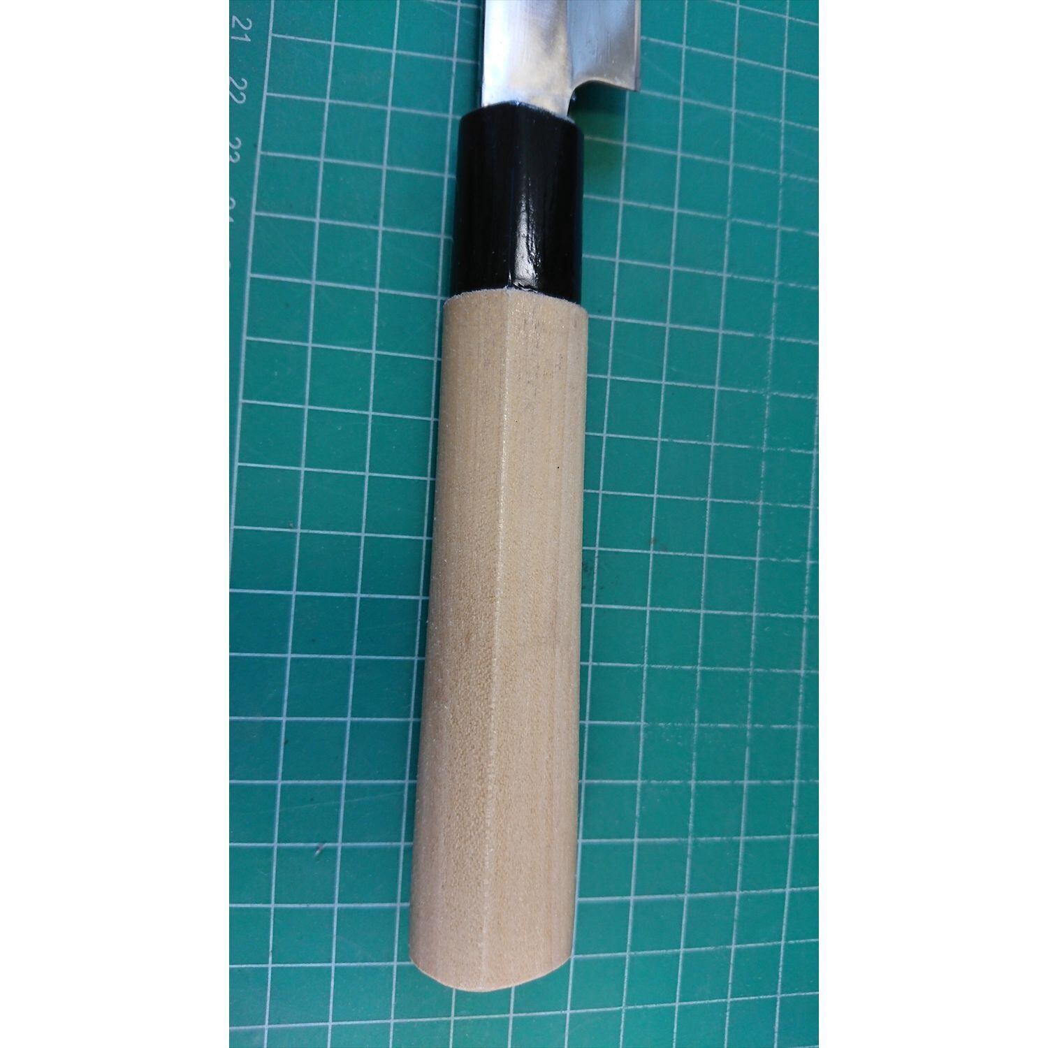 1. o3436/状態:中古/銘:銘?/刺身包丁(両刃 約 左1:右9 右利き用)/刃長:215/峰厚 アゴ上:3.1/重量:100/作り:鋼/他:柄は当社にて新品と交換済み。ツバの根元から柄全体にかけて樹脂コーティング済み(防サビ防汚の為)