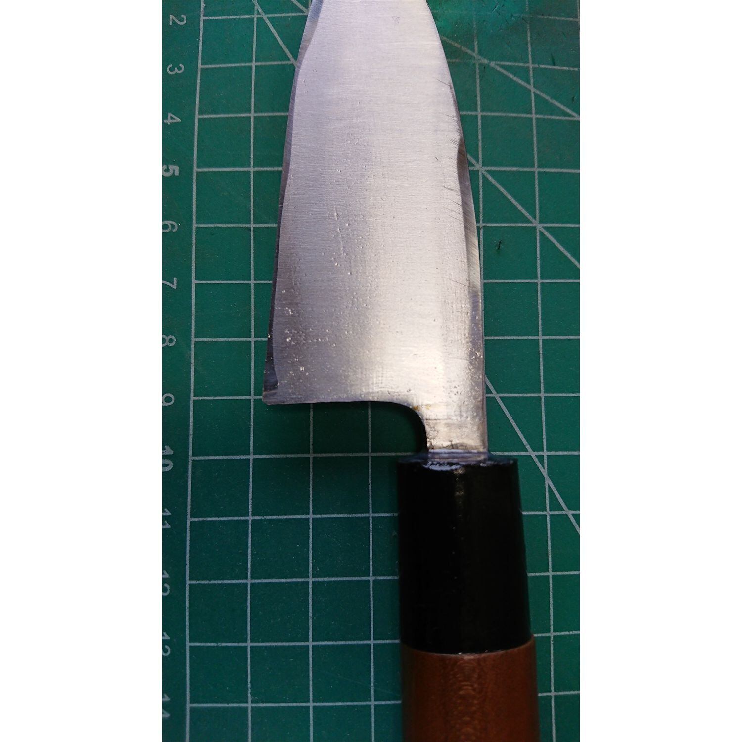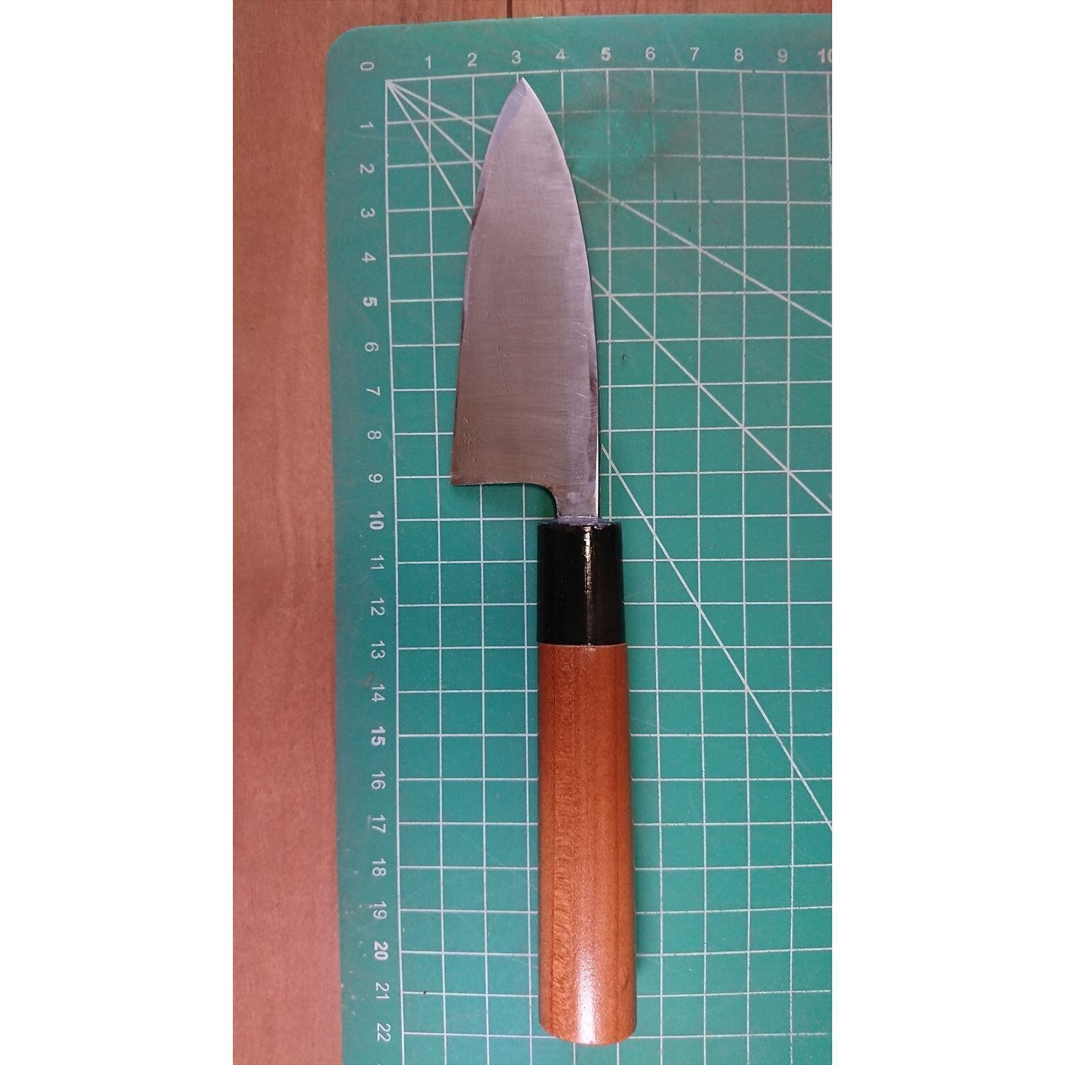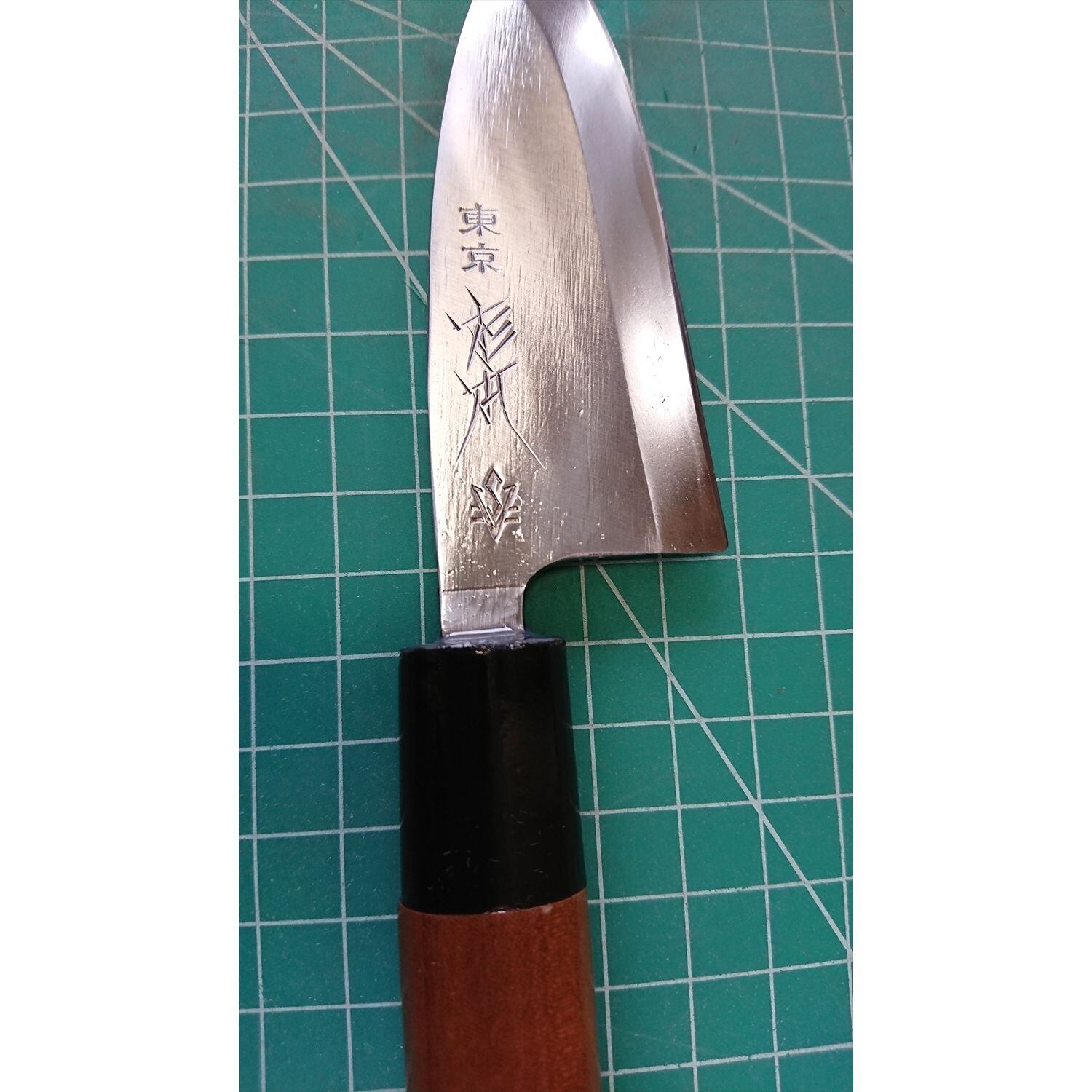 1. o3451/状態:中古/銘:東京杉本/小出刃包丁(片刃 右利き用)/刃長:90/峰厚 アゴ上:4.3/重量:70/作り:鋼/他:ツバの根元から柄全体にかけて樹脂コーティング済み(防サビ防汚の為)