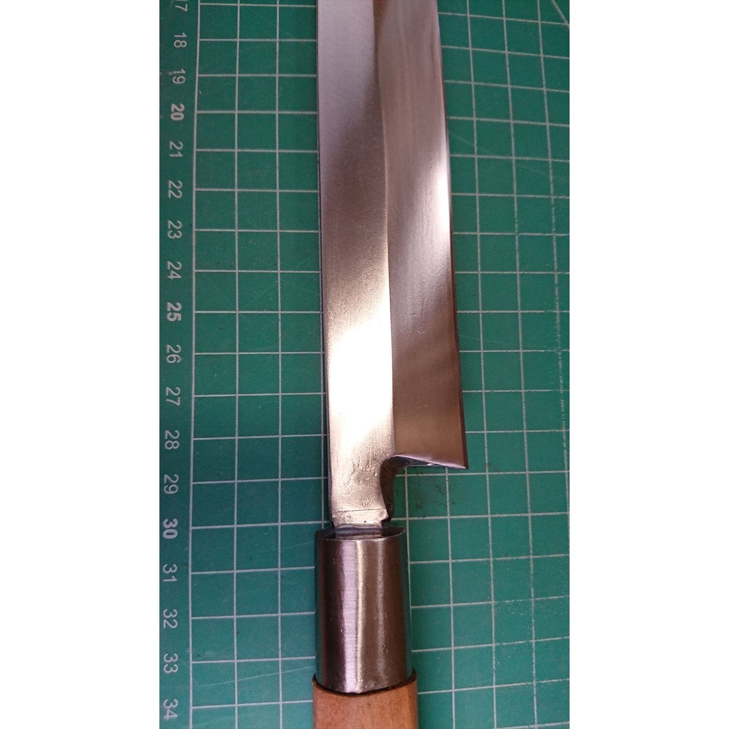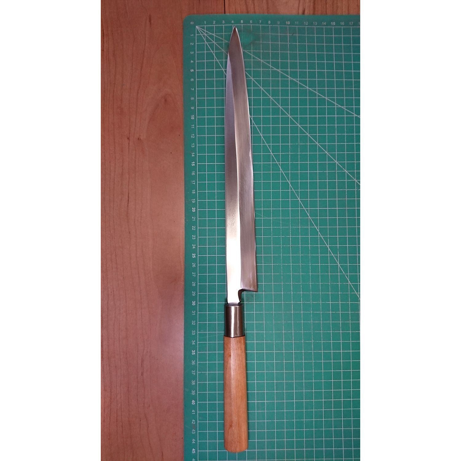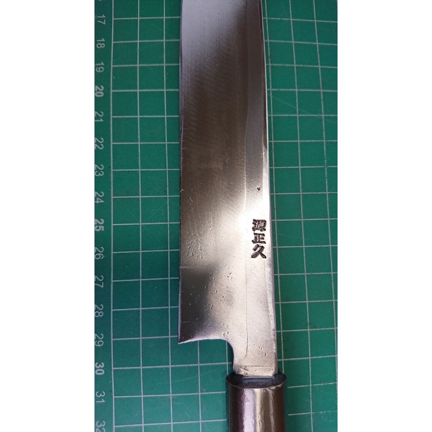 1. o3472/状態:中古/銘:源正久/刺身包丁(片刃 右利き用)/刃長:290/峰厚 アゴ上:4.4/重量:196/作り:鋼/他:ツバの根元から柄全体にかけて樹脂コーティング済み(防サビ防汚の為)