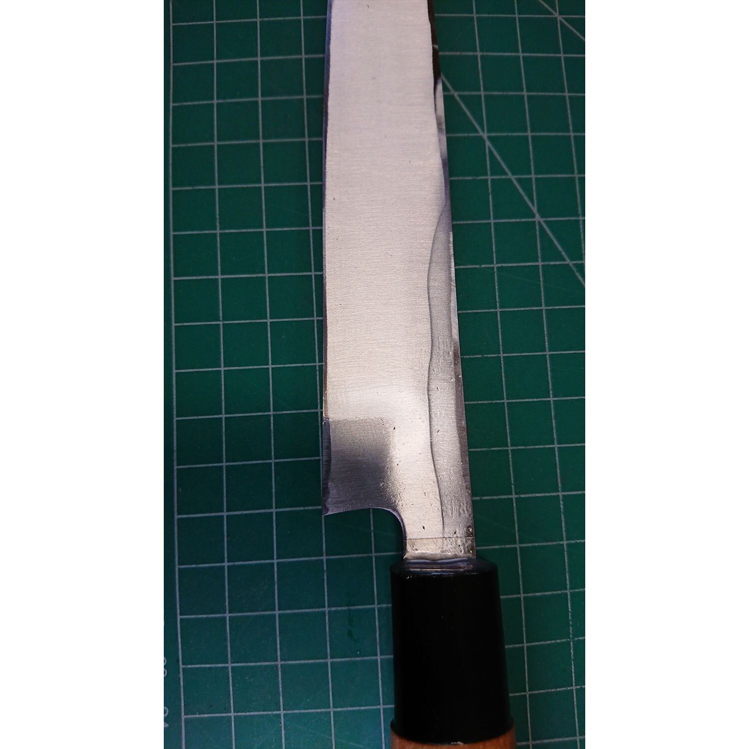 1. o3476/状態:中古/銘:銘?/刺身包丁(片刃 右利き用)/刃長:200/峰厚 アゴ上:3.3/重量:98/作り:鋼/他:ツバの根元から柄全体にかけて樹脂コーティング済み(防サビ防汚の為)