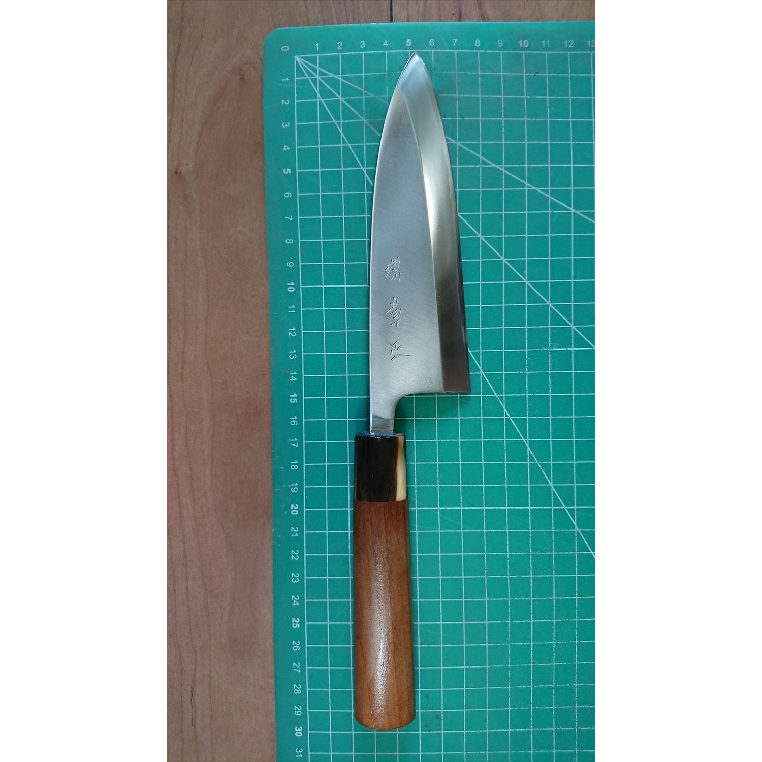1. o3477/状態:中古/銘:堺章正/出刃包丁(片刃 右利き用)/刃長:150/峰厚 アゴ上:8.0/重量:229/作り:鋼 水牛柄/他:ツバの根元から柄全体にかけて樹脂コーティング済み(防サビ防汚の為)