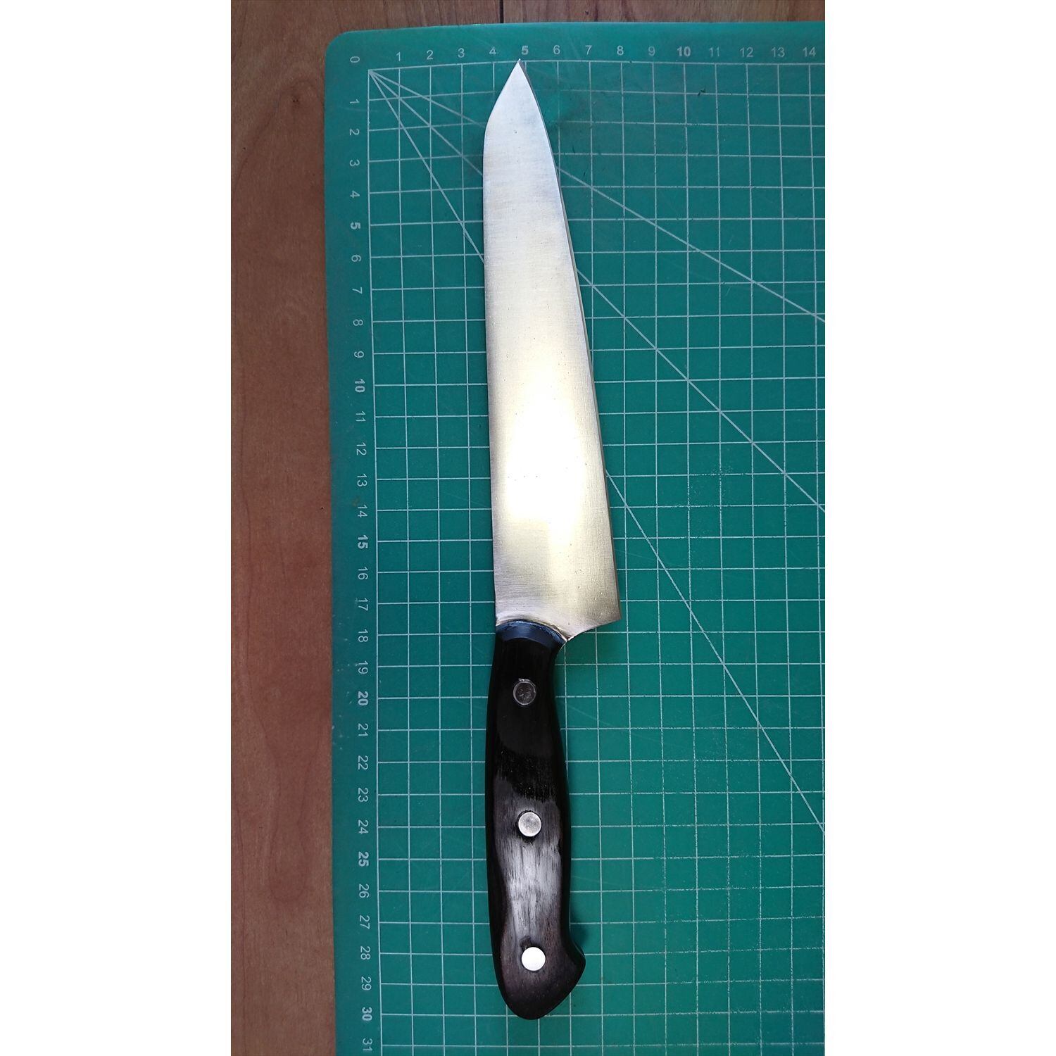 1. o3485/状態:中古/銘:堺孝行/牛刀(両刃 左5:右5 右利き・左利き兼用)/刃長:175/峰厚 アゴ上:1.3/重量:103/作り:STAINLESS STEEL/他:柄はオーバーホール済み