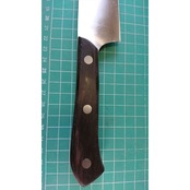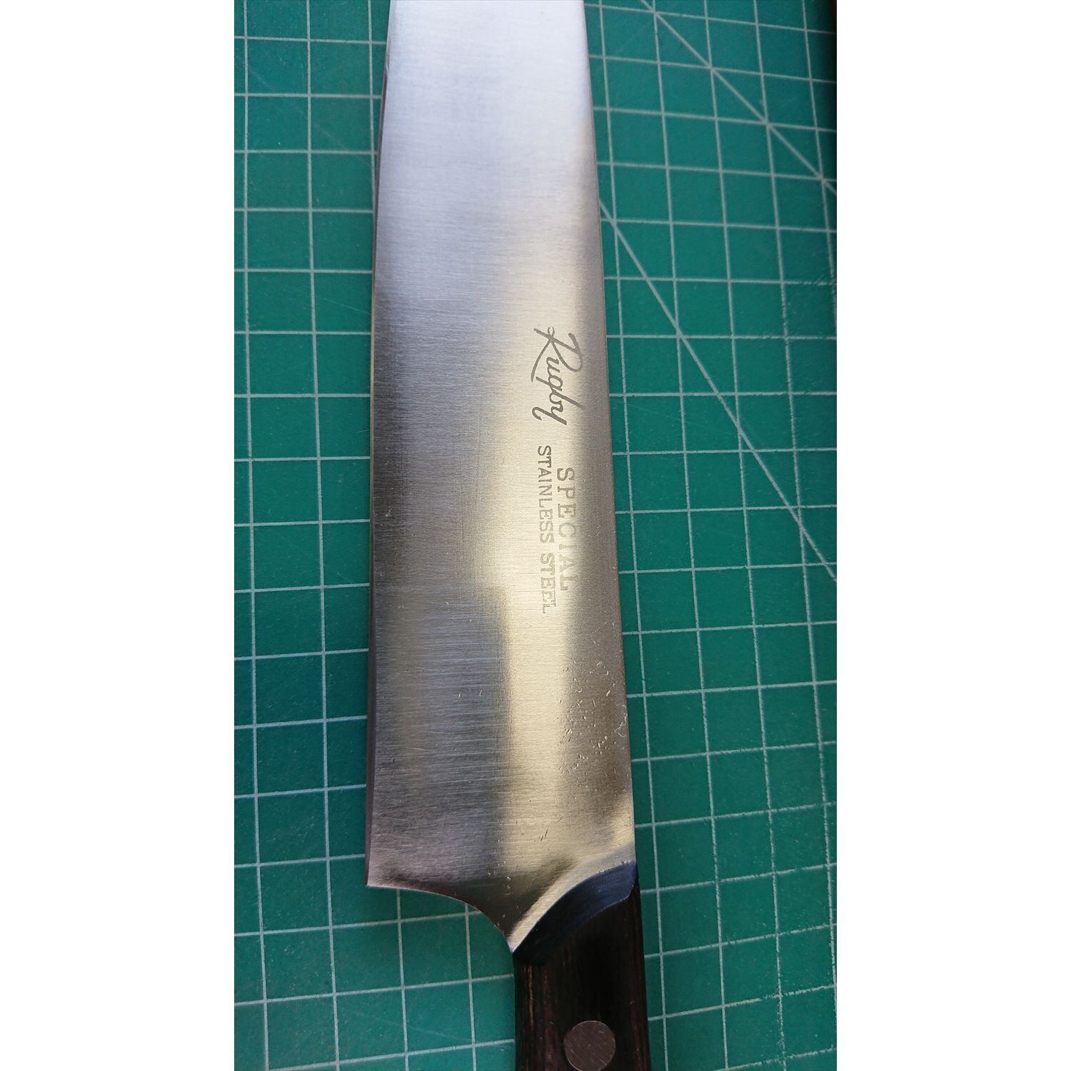 1. o3500/状態:中古/銘:木屋 Rugby/牛刀(両刃 左5:右5 右利き・左利き兼用)/刃長:220/峰厚 アゴ上:2.3/重量:161/作り:INOX/他:箱付き(汚れ、破れあり)