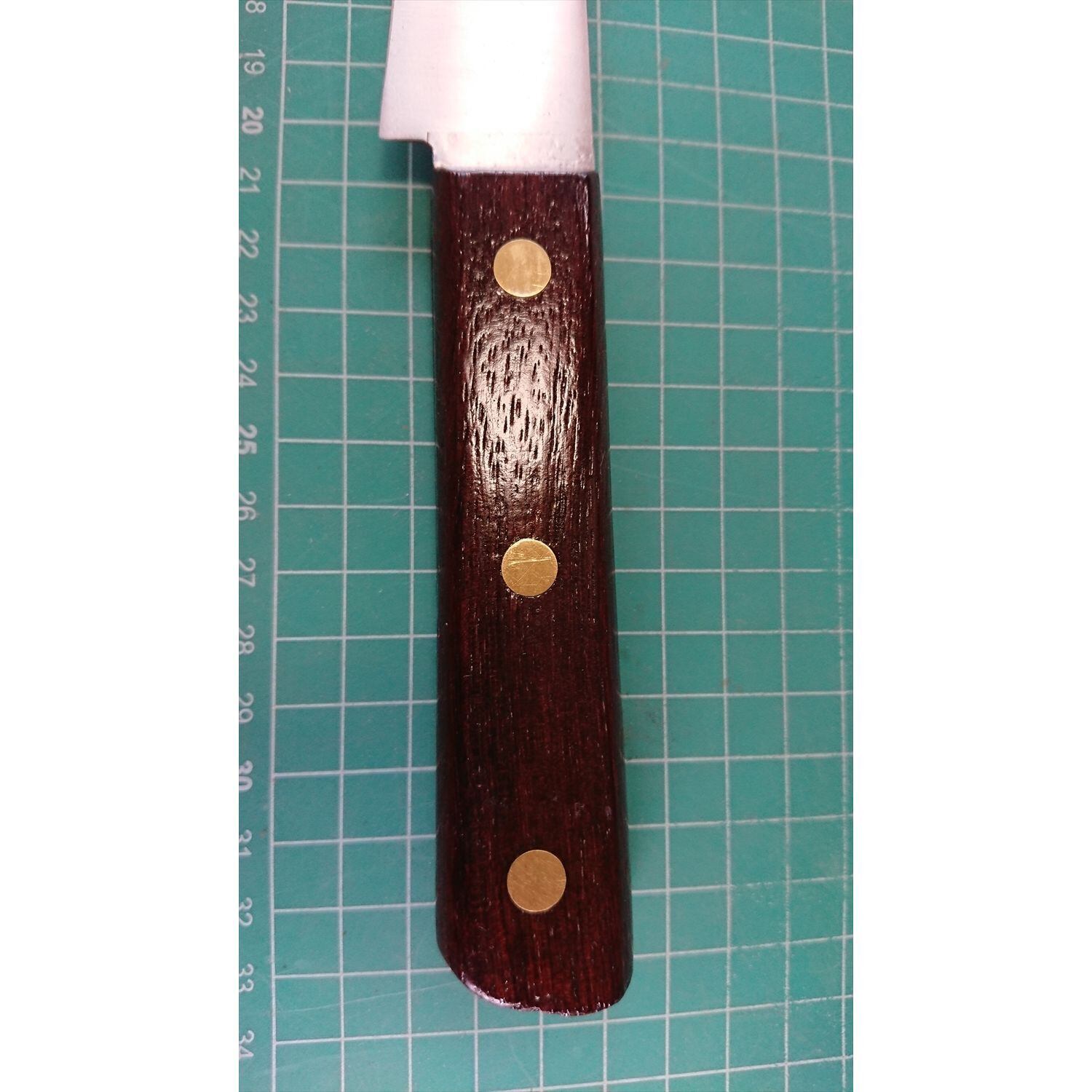1. o3490/状態:中古/銘:南常/筋引包丁(両刃 約 左1:右9 右利き用)/刃長:205/峰厚 アゴ上:2.2/重量:143/作り:ステンレス系/他:銘は消滅。ツバの根元から柄全体にかけて樹脂コーティング済み(防サビの為)