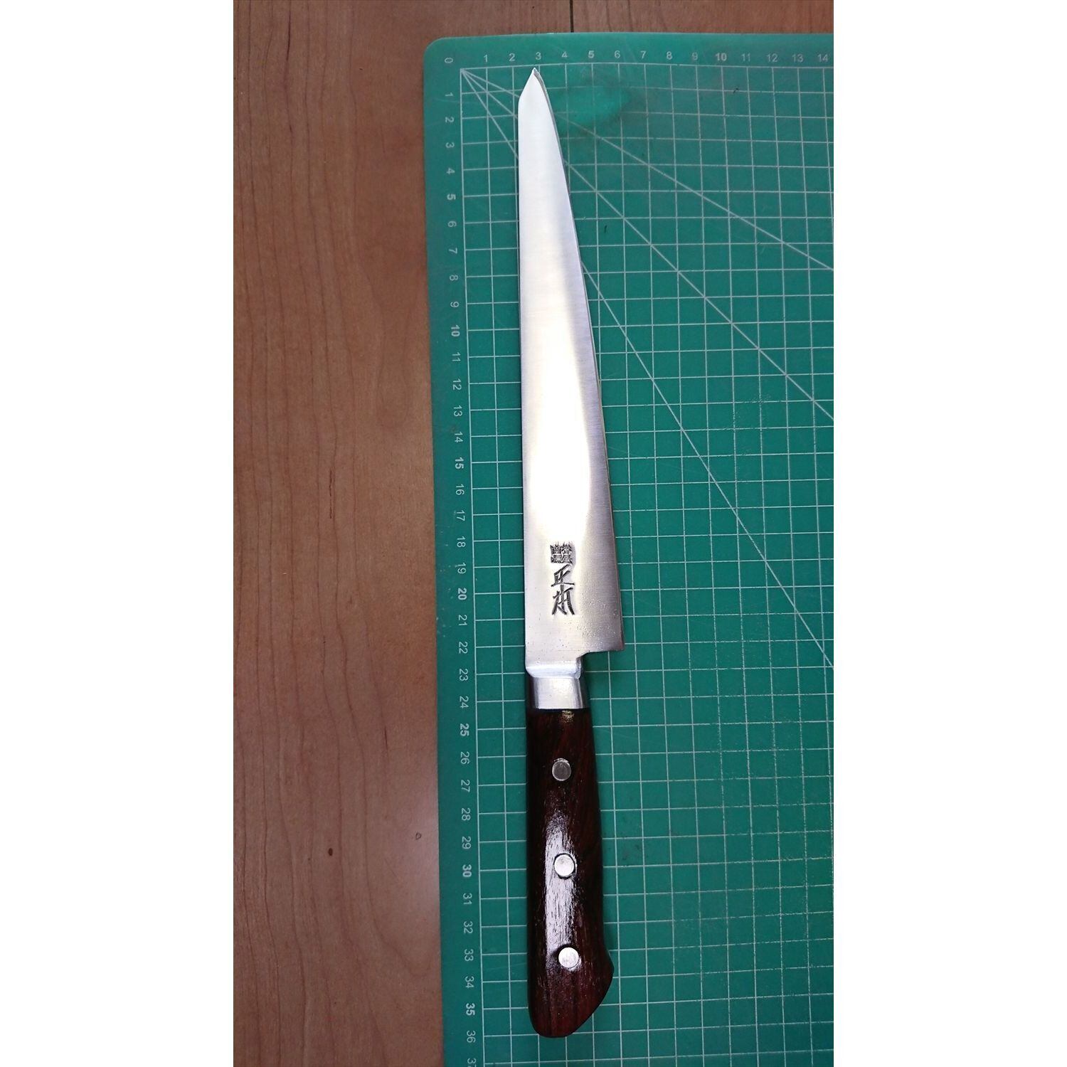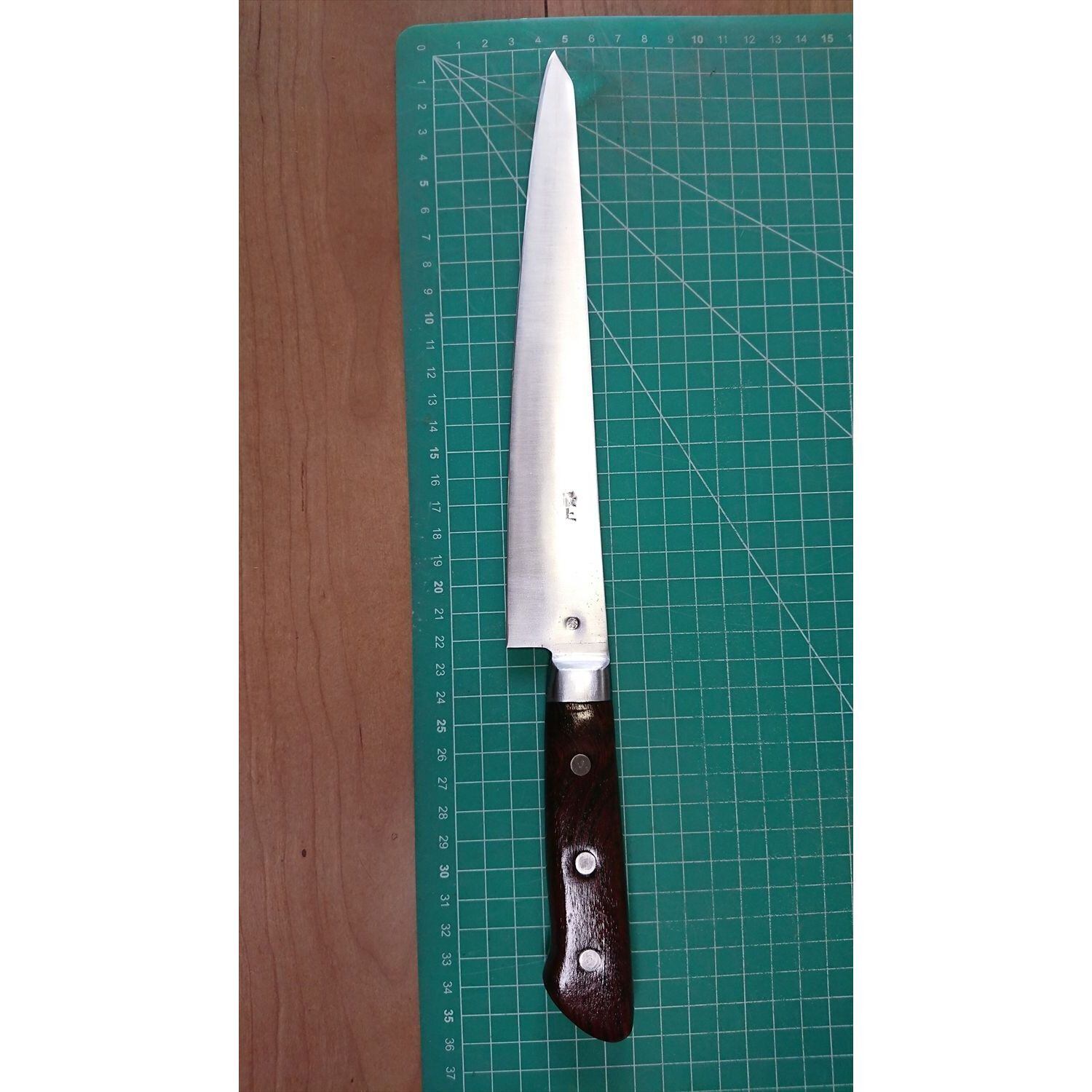 1. o3538/状態:中古/銘:正本/筋引包丁(両刃 左5:右5 右利き・左利き兼用)/刃長:220/峰厚 アゴ上:2.1/重量:157/作り:鋼 最上/他:柄はオーバーホール済み。ツバの根元から柄全体にかけて樹脂コーティング済み(防サビ防汚の為)