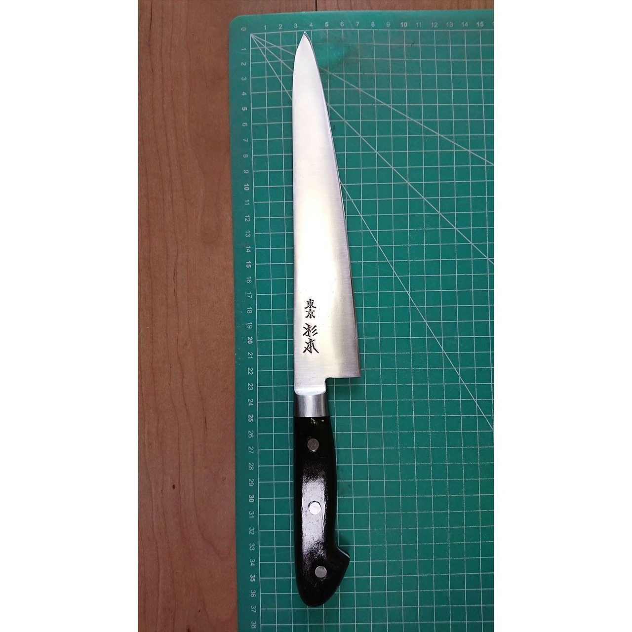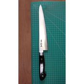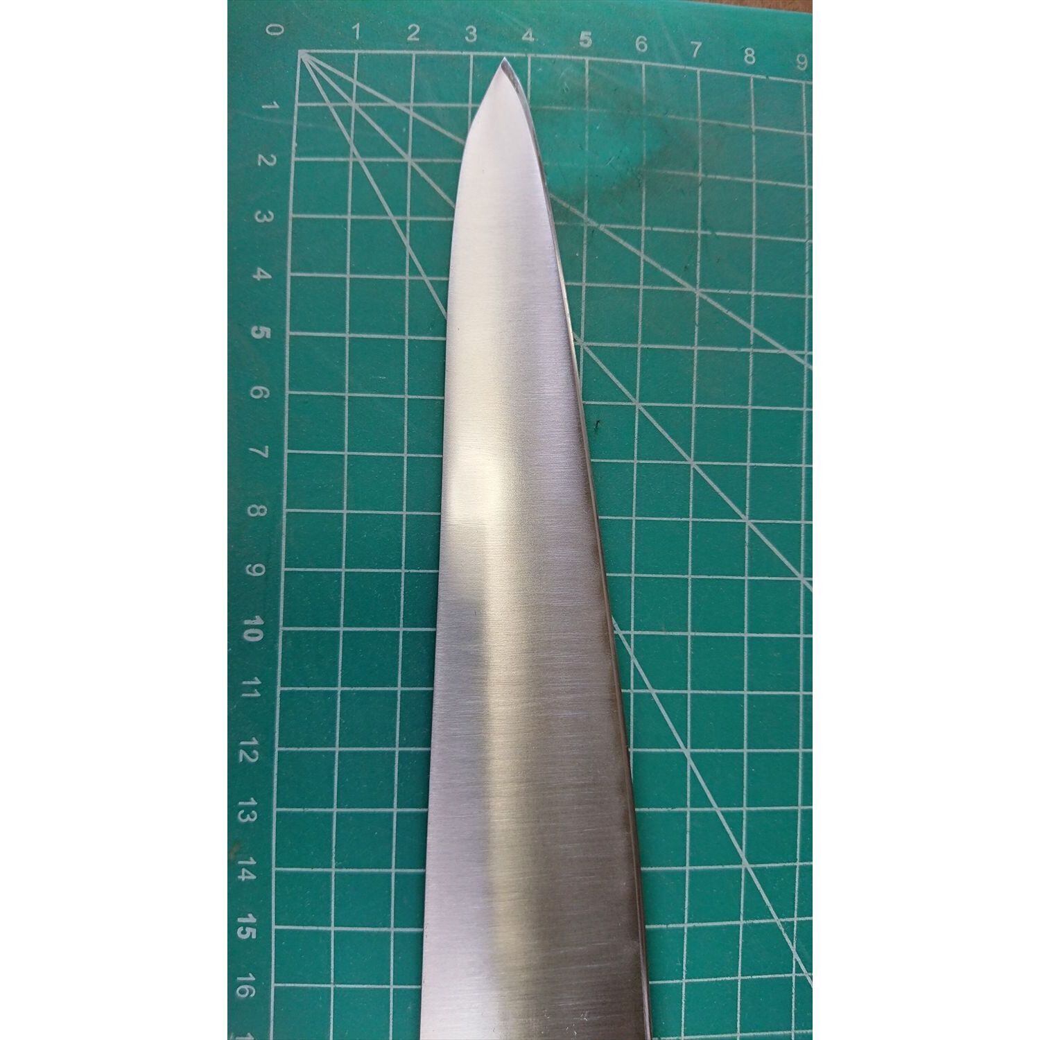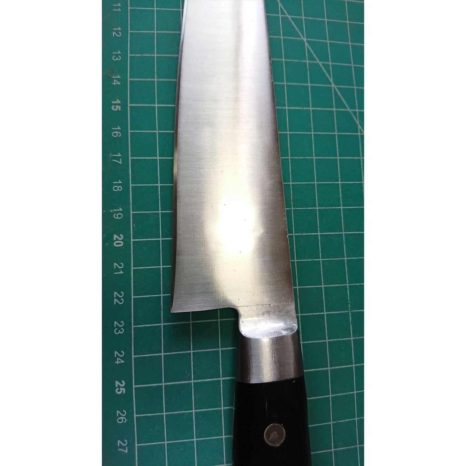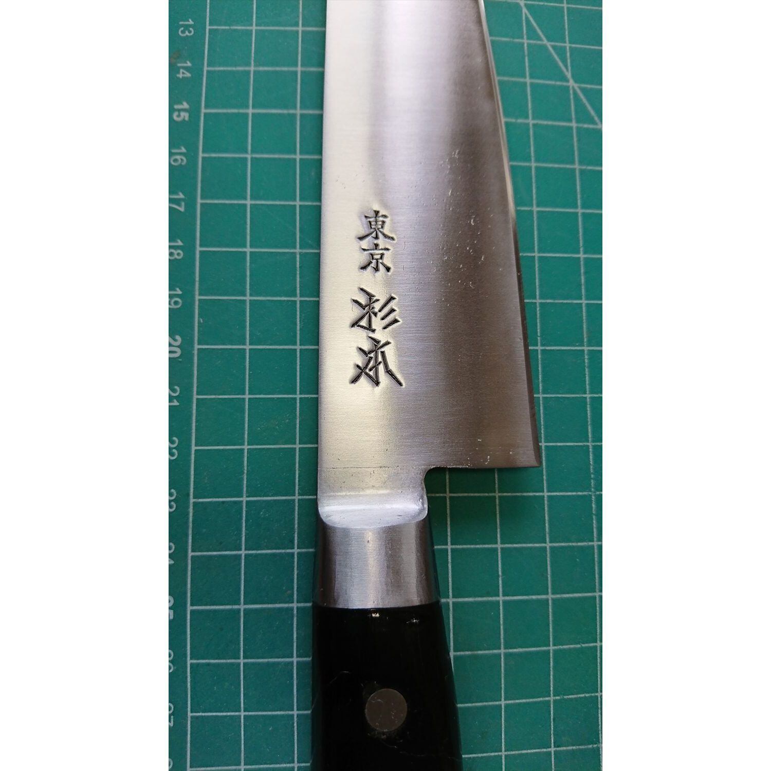 1. o3539/状態:中古/銘:東京杉本/牛刀(両刃 左5:右5 右利き・左利き兼用)/刃長:225/峰厚 アゴ上:2.3/重量:199/作り:鋼/他:柄はオーバーホール済み。ツバの根元から柄全体にかけて樹脂コーティング済み(防サビ防汚の為)
