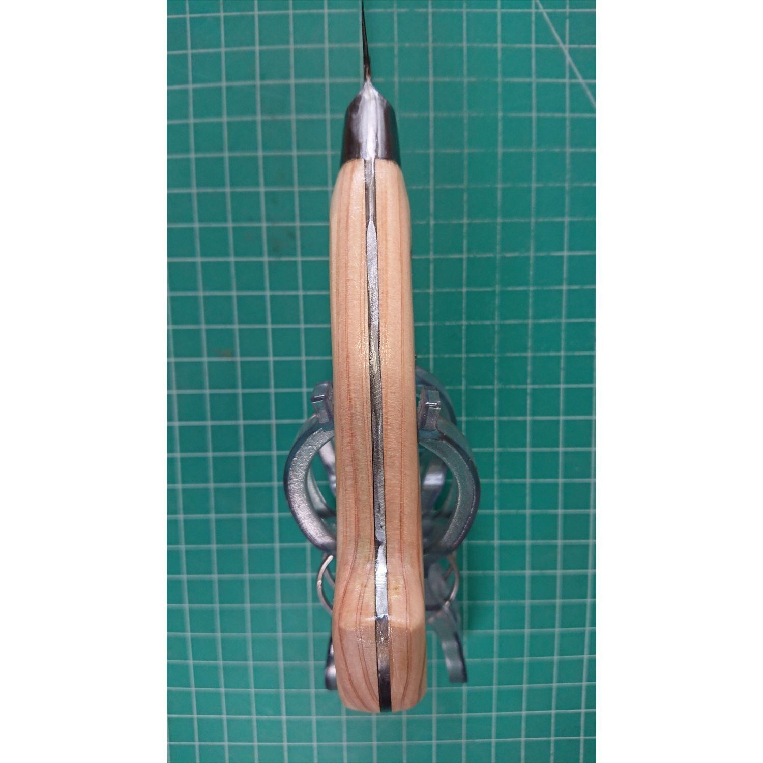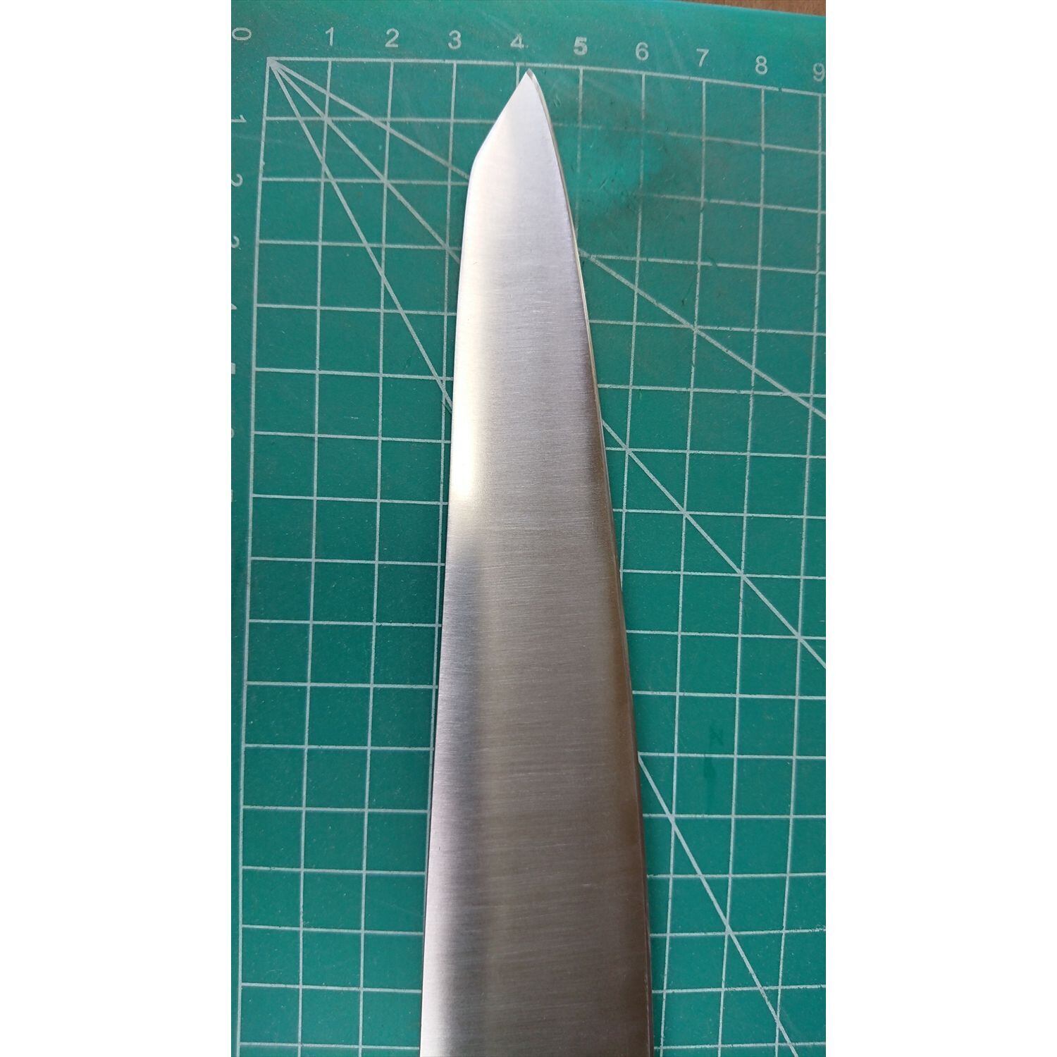 1. o3537/状態:中古/銘:東京杉本/牛刀(両刃 左5:右5 右利き・左利き兼用)/刃長:220/峰厚 アゴ上:2.0/重量:153/作り:鋼/他:柄はワンオフ(ひのき)と交換済み。ツバの根元から柄全体にかけて樹脂コーティング済み(防サビ防汚の為)