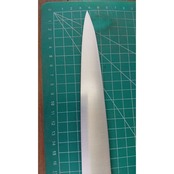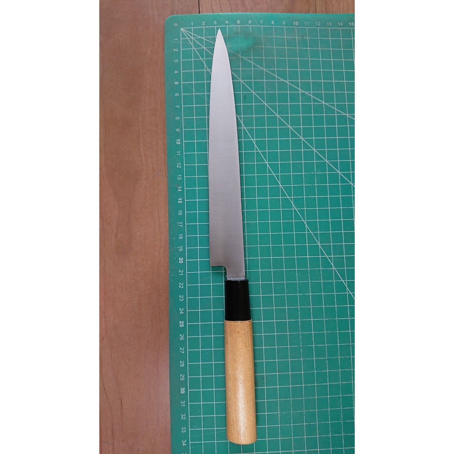 1. o3557/状態:中古/銘:関宗景/刺身包丁(両刃 約 左1:右9 右利き用)/刃長:200/峰厚 アゴ上:1.9/重量:79/作り:ステンレス系?/他:ツバの根元から柄全体にかけて樹脂コーティング済み(防サビ防汚の為)
