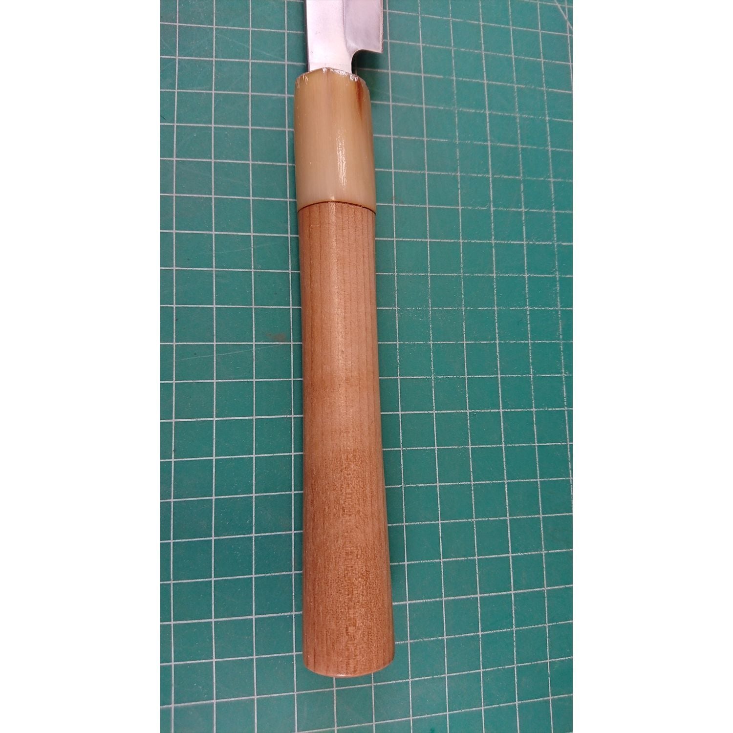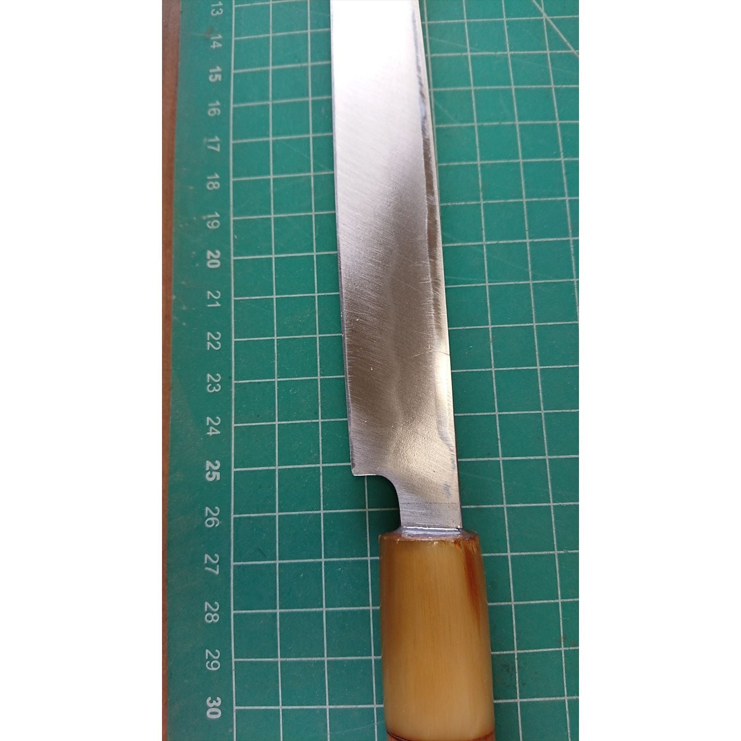 1. o3529/状態:中古/銘:有次 純日本鋼/刺身包丁(片刃 右利き用)/刃長:250/峰厚 アゴ上:2.4/重量:94/作り:水牛柄 純日本鋼/他:ツバの根元から柄全体にかけて樹脂コーティング済み(防サビ防汚の為)
