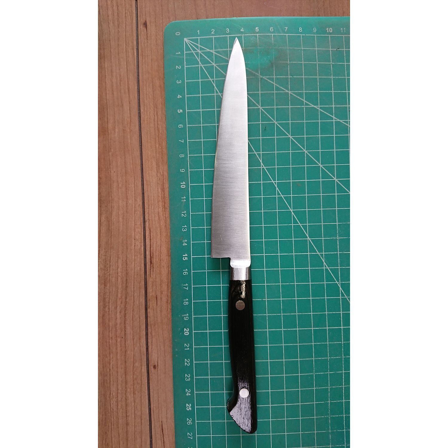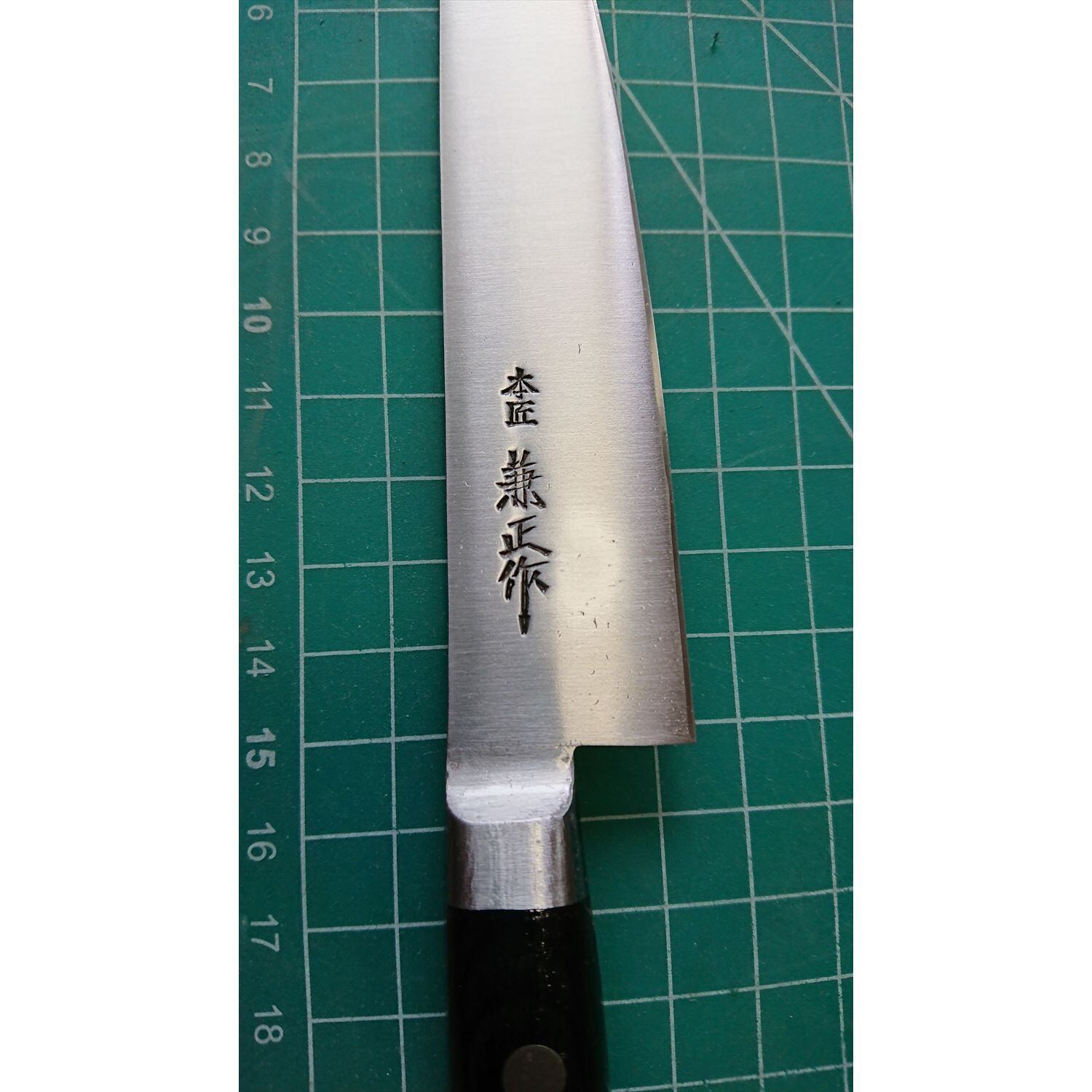 1. o3574/状態:中古/銘:本匠兼正/ペティナイフ(両刃 左5:右5 右利き・左利き兼用)/刃長:150/峰厚 アゴ上:1.4/重量:66/作り:鋼/他:ツバの根元から柄全体にかけて樹脂コーティング済み(防サビ防汚の為)