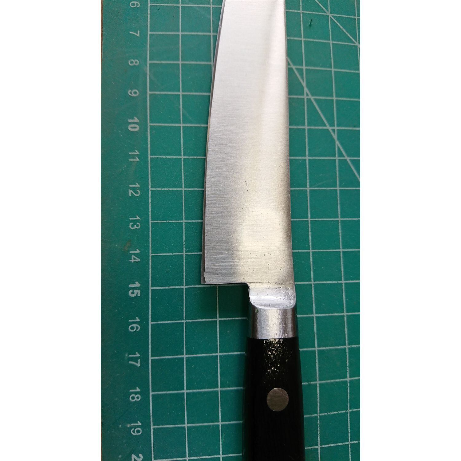 1. o3575/状態:中古/銘:本匠兼正/ペティナイフ(両刃 左5:右5 右利き・左利き兼用)/刃長:150/峰厚 アゴ上:1.4/重量:66/作り:鋼/他:ツバの根元から柄全体にかけて樹脂コーティング済み(防サビ防汚の為)