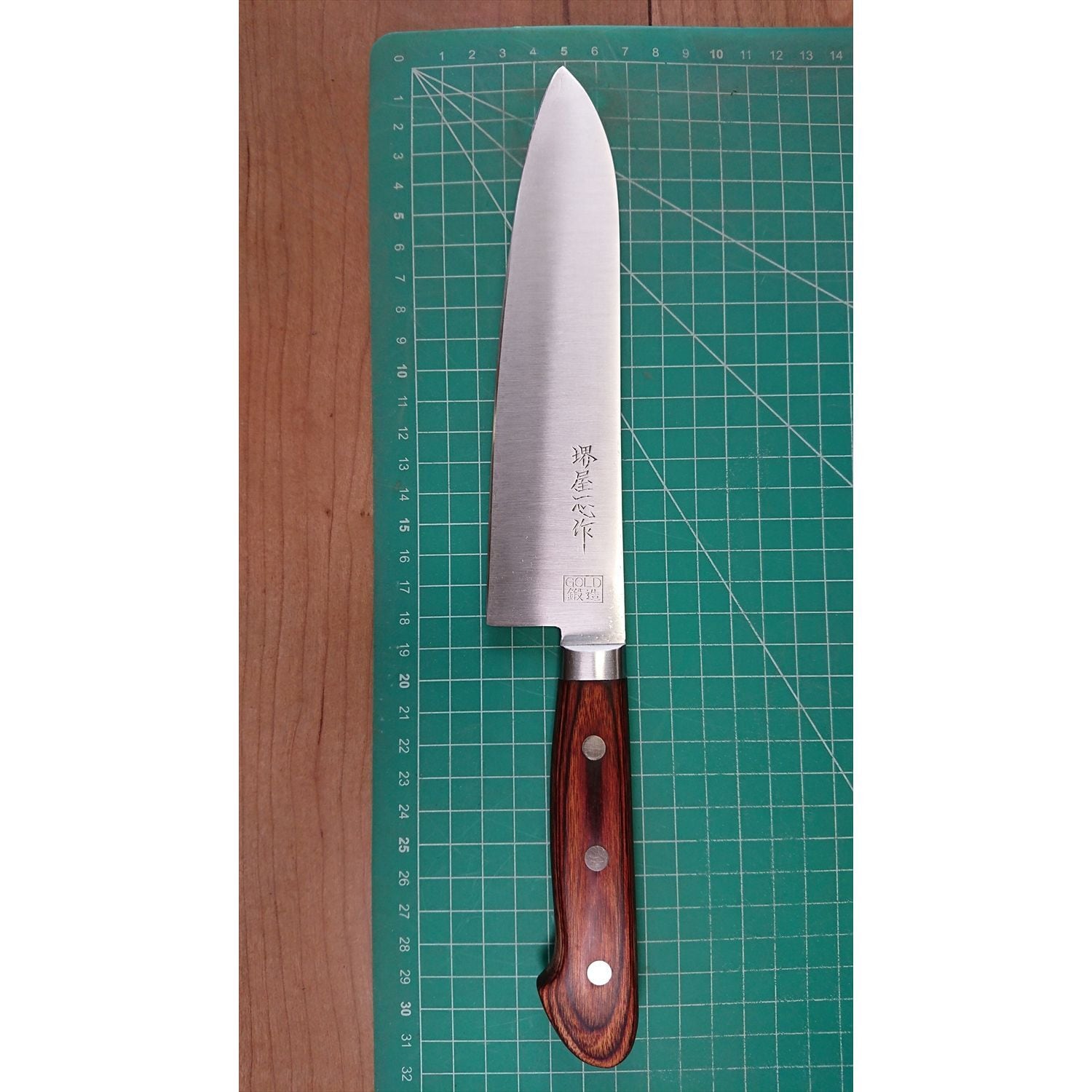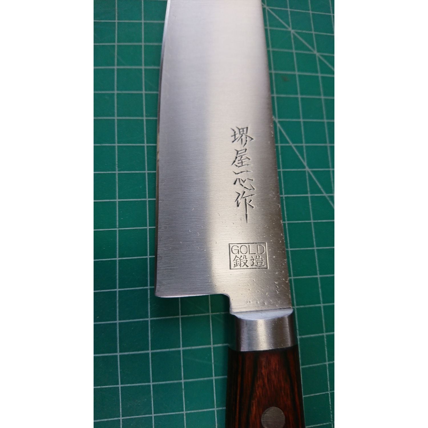 1. o3595/状態:中古/銘:堺屋一心/牛刀(両刃 左5:右5 右利き・左利き兼用)/刃長:180/峰厚 アゴ上:1.9/重量:161/作り:GOLD鍛造(鋼をステンレスでサンド)/他: