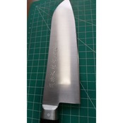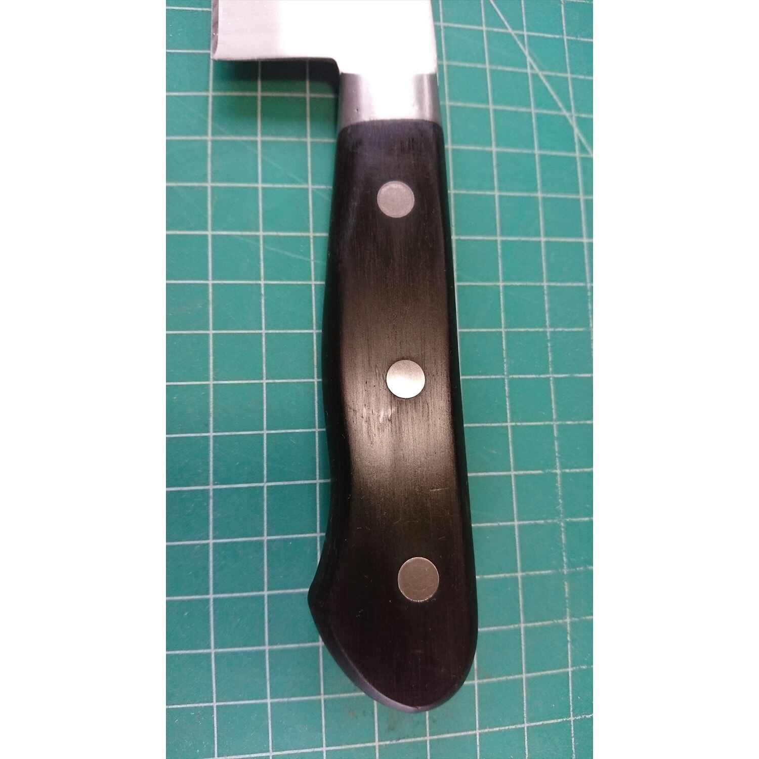 1. o3601/状態:中古/銘:関孫六 村雨/三徳包丁(両刃 左5:右5 右利き・左利き兼用)/刃長:165/峰厚 アゴ上:1.9/重量:141/作り:本割込鋼(鋼をステンレスでサンド)/他: