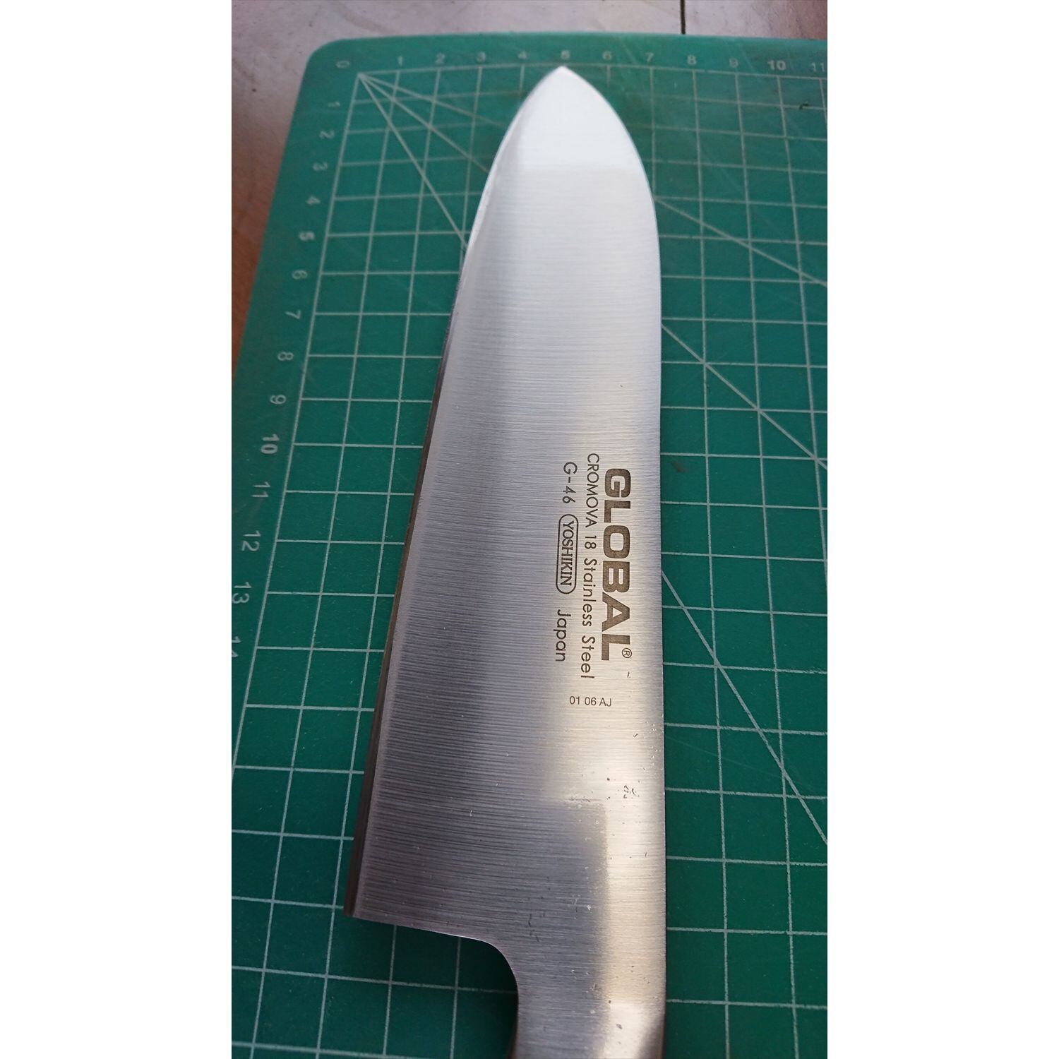 1. o3642/状態:中古/銘:GLOBAL(グローバル) G-46/三徳包丁(両刃 左5:右5 右利き・左利き兼用)/刃長:180/峰厚 アゴ上:2.1/重量:178/作り:CROMOVA 18 Stainless Steel/他: