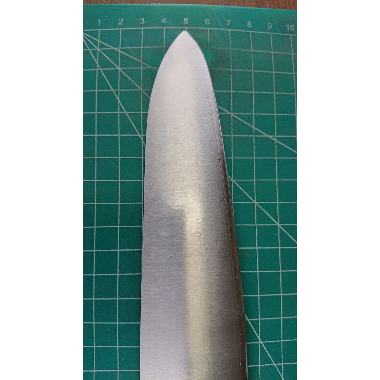 1. o3610/状態:中古/銘:菊一文字/牛刀(両刃 左5:右5 右利き・左利き兼用)/刃長:180/峰厚 アゴ上:2.7/重量:143/作り:本割込鋼(鋼をステンレスでサンド)/他:
