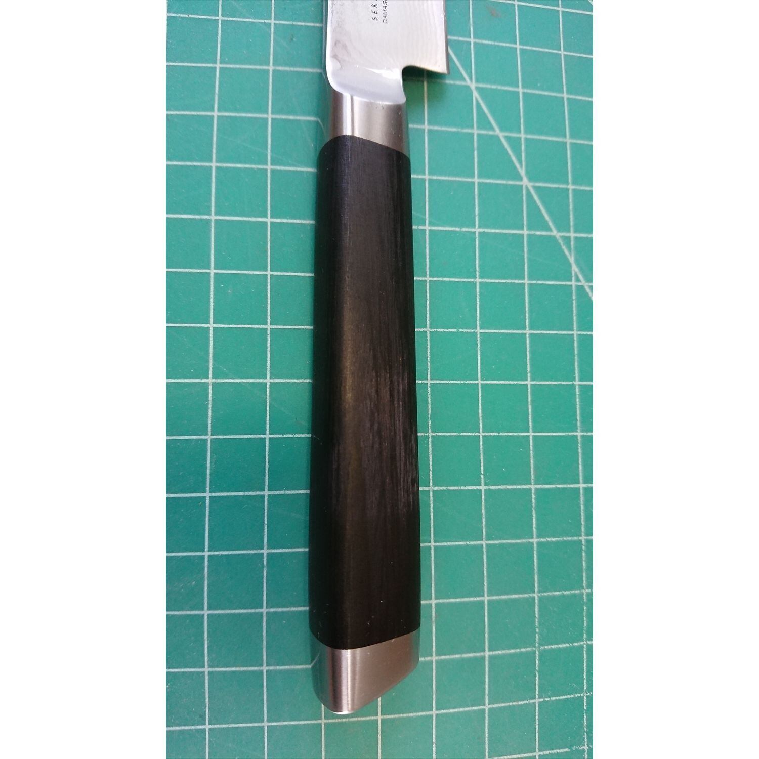 1. o3682/状態:中古/銘:関孫六ダマスカス/ペティナイフ(両刃 左5:右5 右利き・左利き兼用)/刃長:120/峰厚 アゴ上:1.5/重量:66/作り:DAMASCUS CLAD STEEL/他: