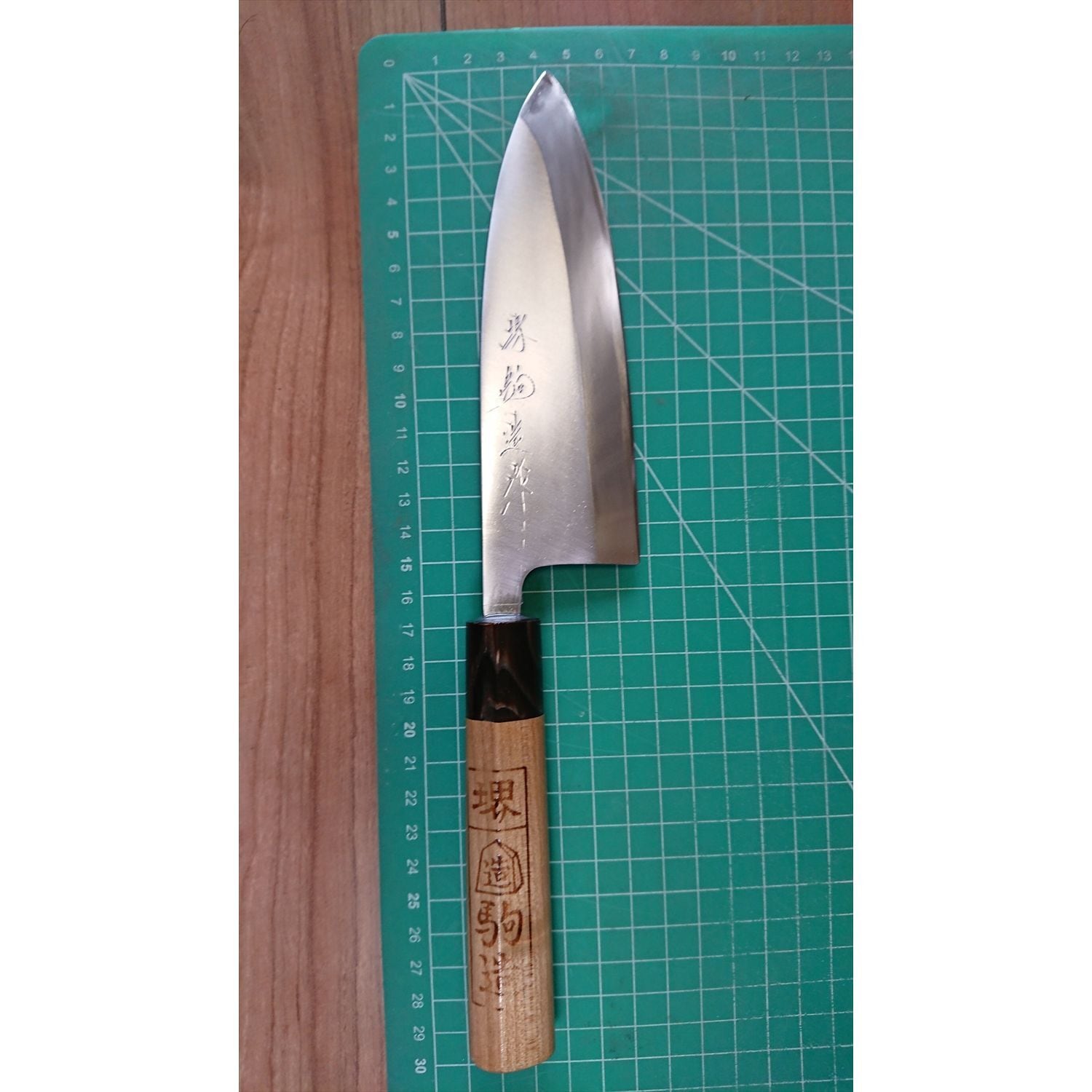 1. o3643/状態:中古/銘:堺駒造/出刃包丁(片刃 右利き用)/刃長:150/峰厚 アゴ上:7.9/重量:235/作り:特製正鋼 水牛柄/他:ツバの根元から柄全体にかけて樹脂コーティング済み(防サビ防汚の為)