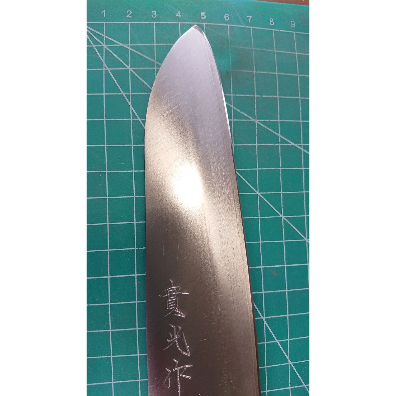 1. o3691/状態:中古/銘:實光作 青鋼/三徳包丁(両刃 左5:右5 右利き・左利き兼用)/刃長:165/峰厚 アゴ上:2.0/重量:123/作り:青鋼(青鋼をステンレスでサンド)/他: