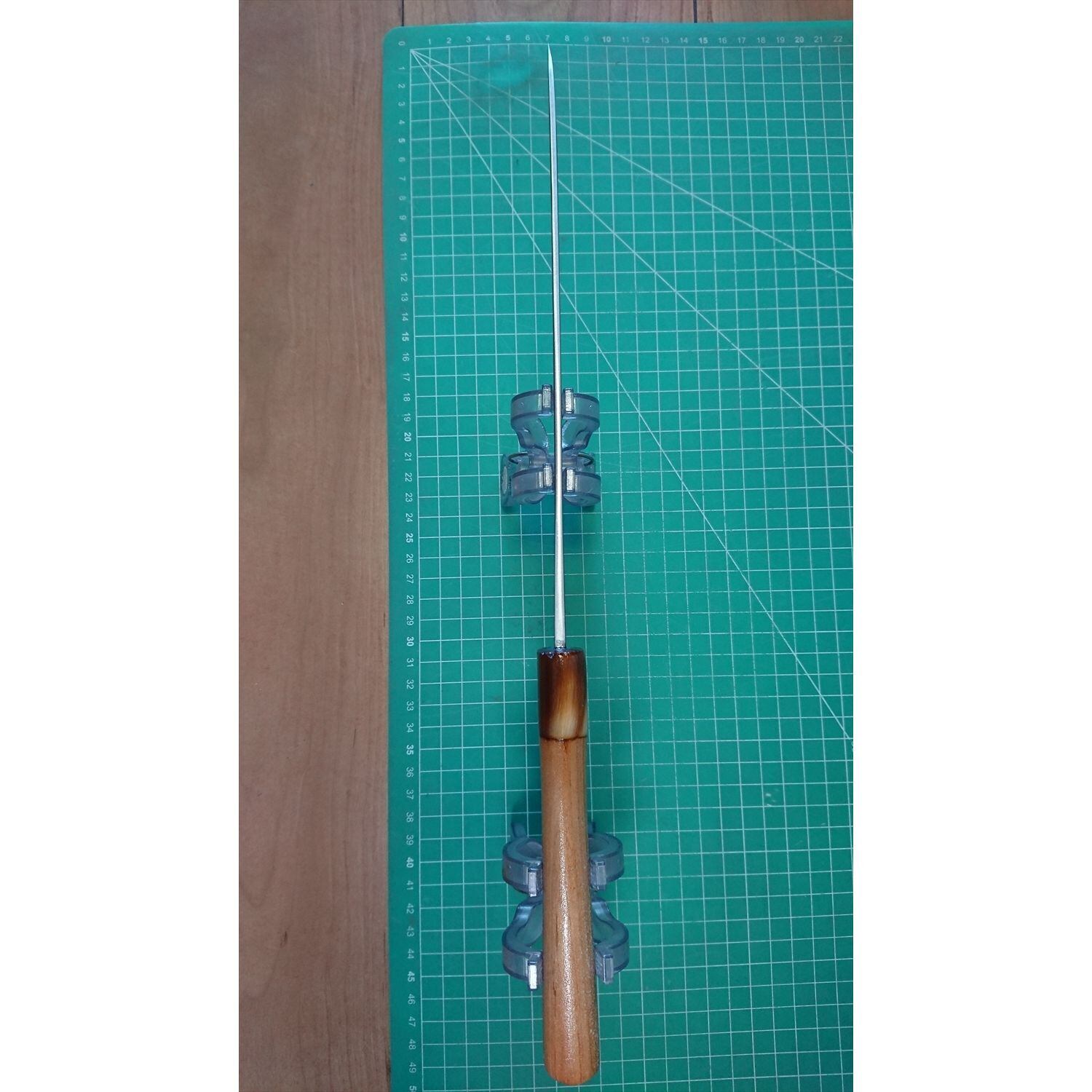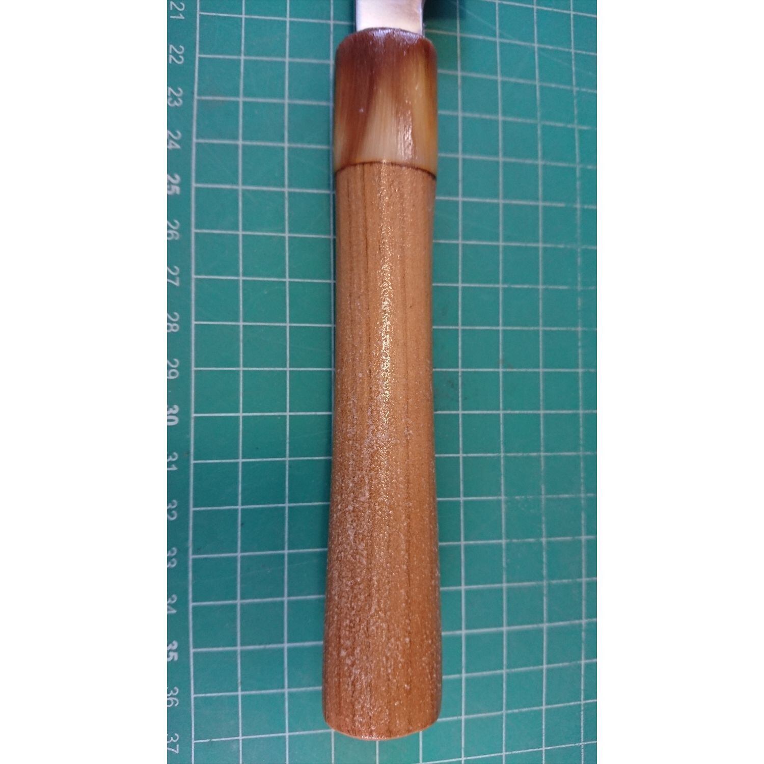 1. o3620/状態:中古/銘:銘?/刺身包丁(両刃 約 左1:右9 右利き用)/刃長:205/峰厚 アゴ上:3.7/重量:137/作り:鋼 水牛柄/他:ツバの根元から柄全体にかけて樹脂コーティング済み(防汚防サビの為)