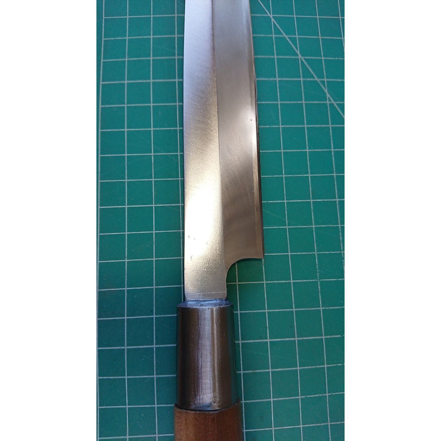1. o3621/状態:中古/銘:四郎丸/刺身包丁(片刃 右利き用)/刃長:220/峰厚 アゴ上:3.6/重量:145/作り:鋼/他:ツバの根元から柄全体にかけて樹脂コーティング済み(防汚防サビの為)
