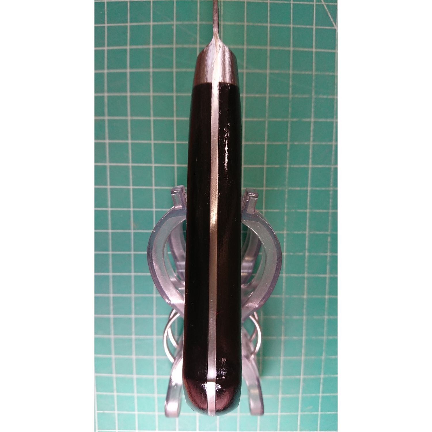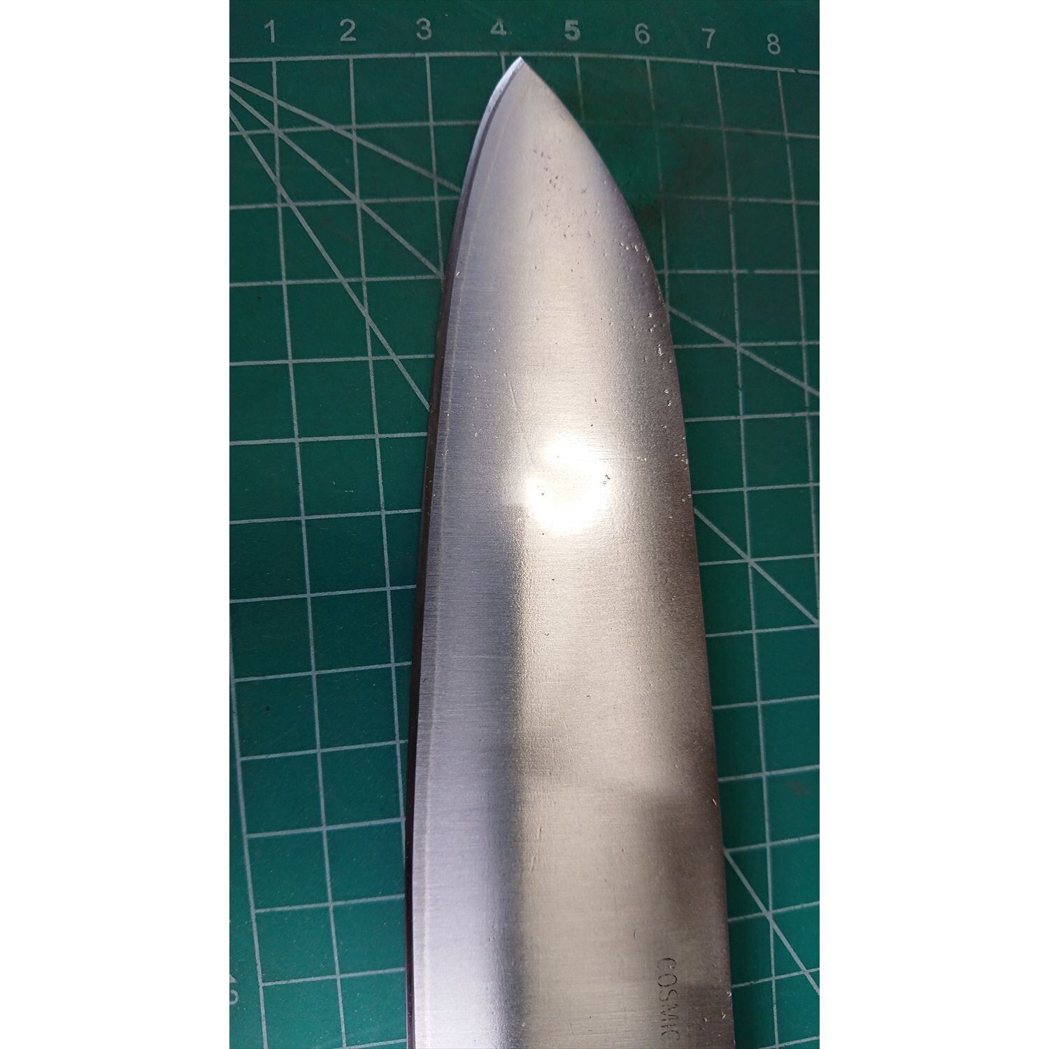 1. o3684/状態:中古/銘:日本橋木屋 團十郎/牛刀(両刃 左5:右5 右利き・左利き兼用)/刃長:180/峰厚 アゴ上:2.0/重量:166/作り:コスミック鋼(粉末鋼)をSUS405ステンレス鋼に割込/他:柄はオーバーホール済み。ツバの根元から柄全体にかけて樹脂コーティング済み(防汚防サビの為)