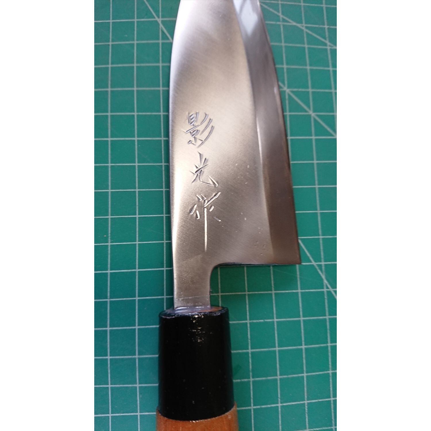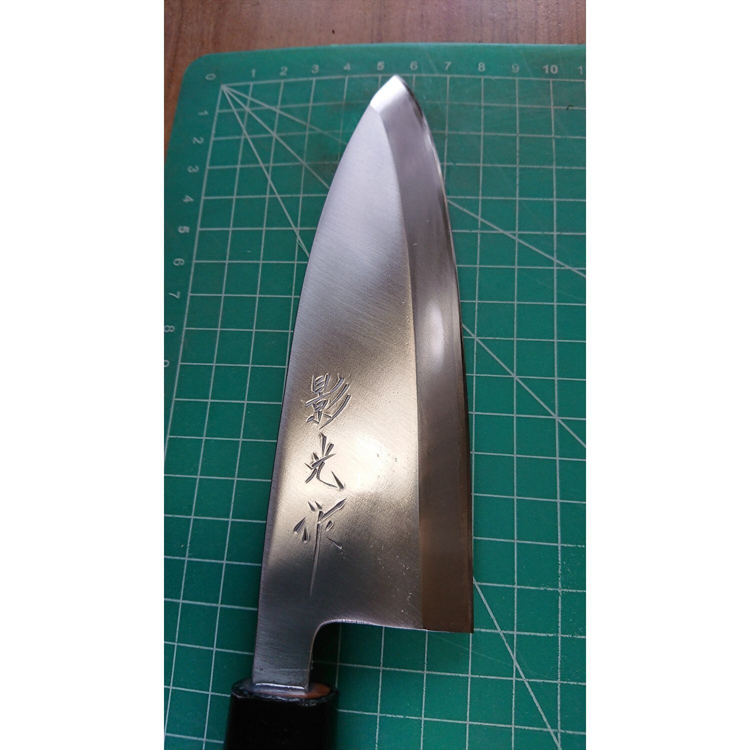 1. o3666/状態:中古/銘:影光/出刃包丁(片刃 右利き用)/刃長:150/峰厚 アゴ上:7.2/重量:256/作り:鋼/他:ツバの根元から柄全体にかけて樹脂コーティング済み(防汚防サビの為)