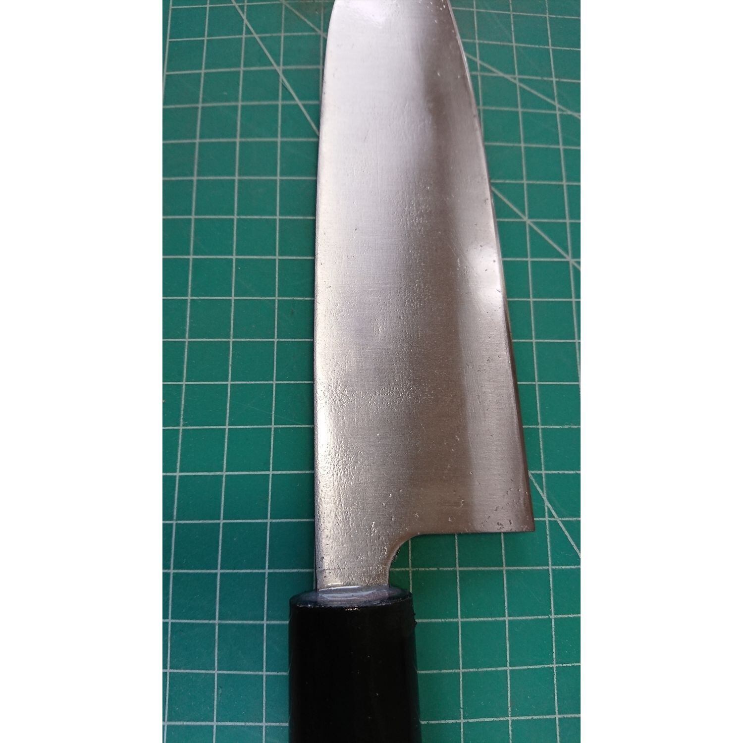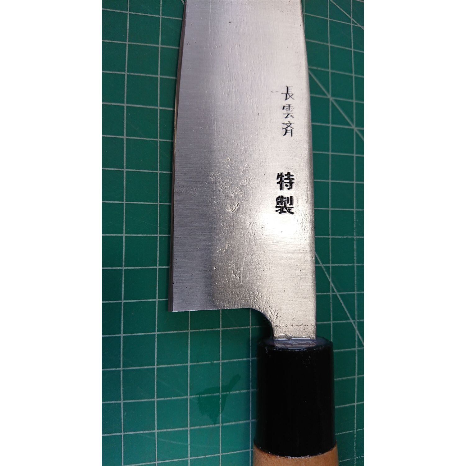 1. o3677/状態:中古/銘:長雲斉/三徳包丁(両刃 左5:右5 右利き・左利き兼用)/刃長:160/峰厚 アゴ上:3.1/重量:125/作り:元黒打/他:ツバの根元から柄全体にかけて樹脂コーティング済み(防汚防サビの為)
