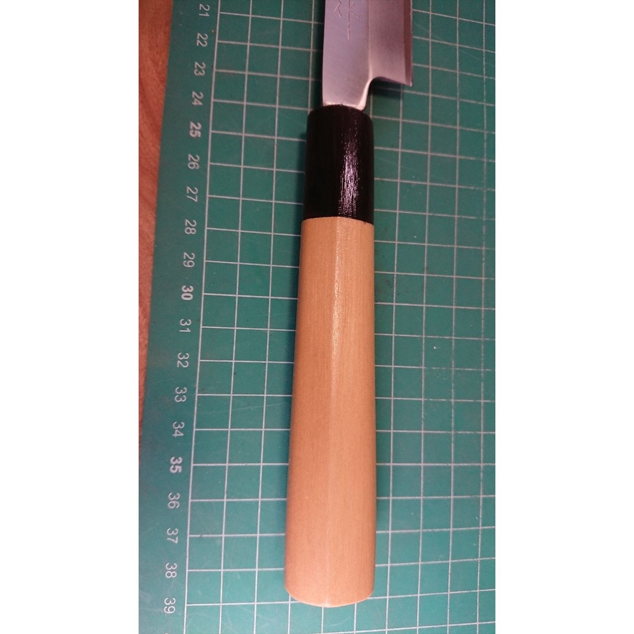 1. o3696/状態:中古/銘:藤次郎/刺身包丁(片刃 右利き用)/刃長:230/峰厚 アゴ上:2.9/重量:123/作り:鋼 水牛柄/他:ツバの根元から柄全体にかけて樹脂コーティング済み(防汚防サビの為)