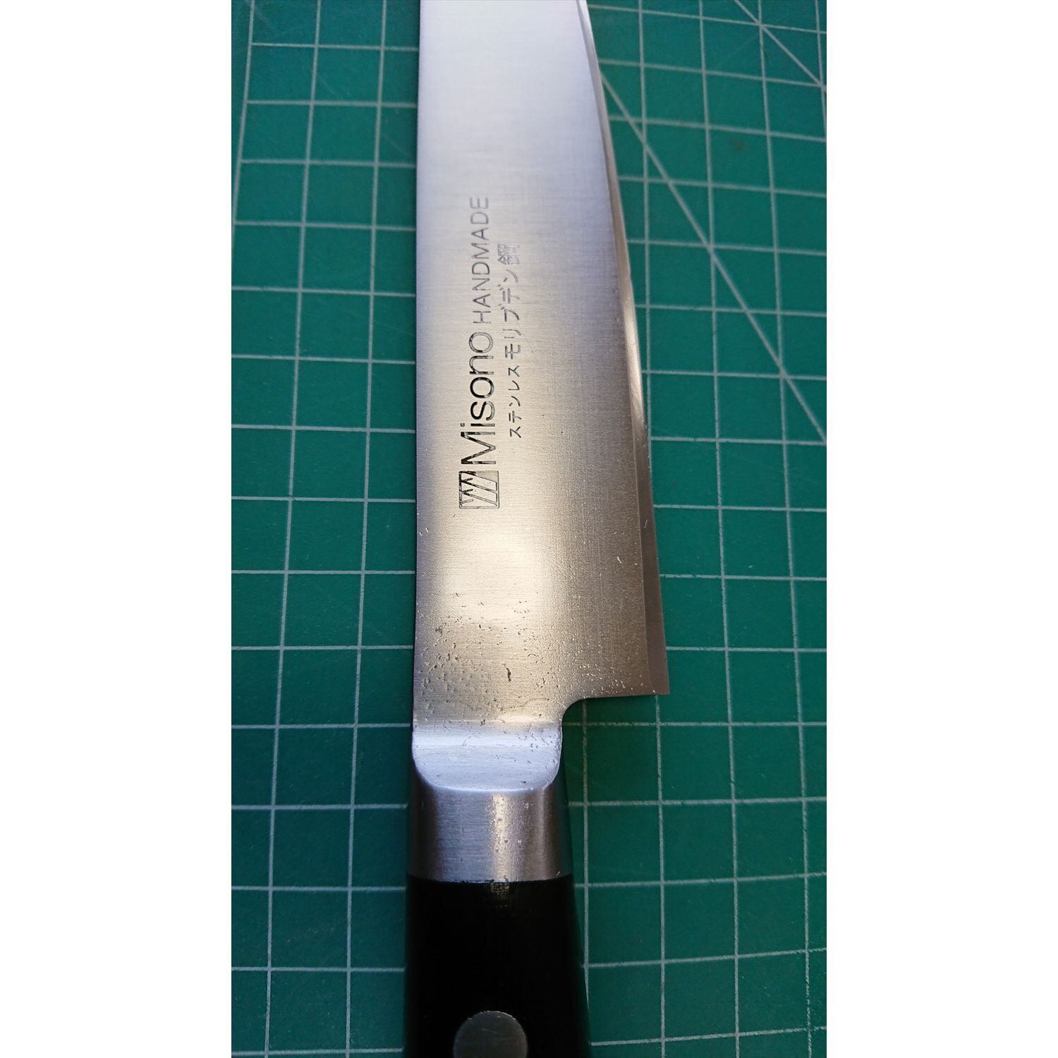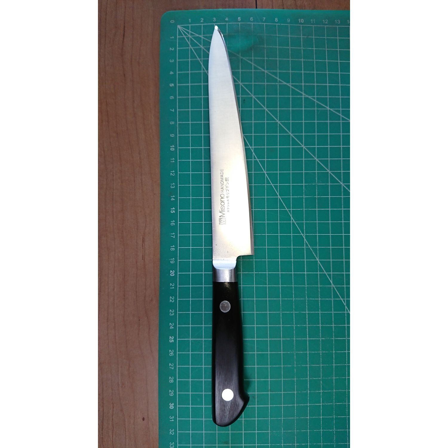 1. o3745/状態:中古/銘:Misono/筋引包丁(両刃 左5:右5 右利き・左利き兼用)/刃長:185/峰厚 アゴ上:2.0/重量:145/作り:HANDMADE ステンレスモリブデン鋼/他: